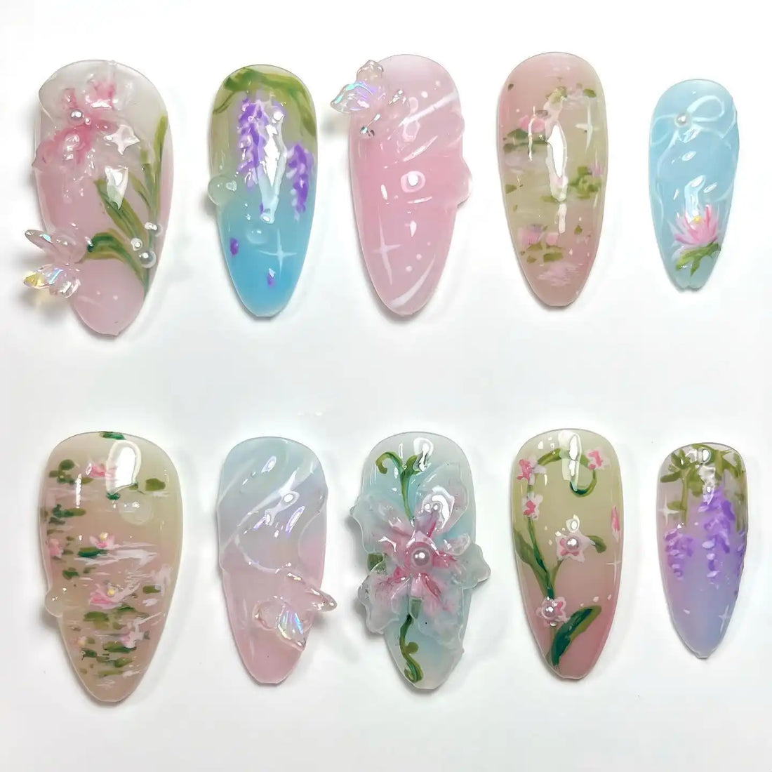 Handmade Lily Pond Floral Garden Fairycore Pastel Spring Press on Nails V72