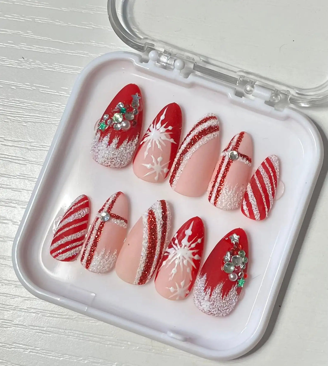Glitter Diamond Snow in Red Christmas Press on Nails - Handmade Fingernails N81