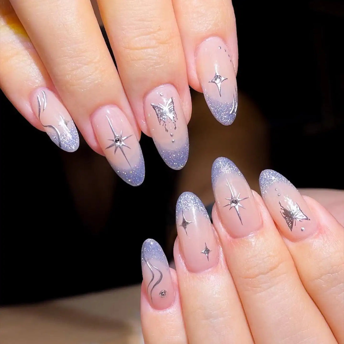Handmade Glitter Purple French with Silver Butterfly Press-on Nails U68