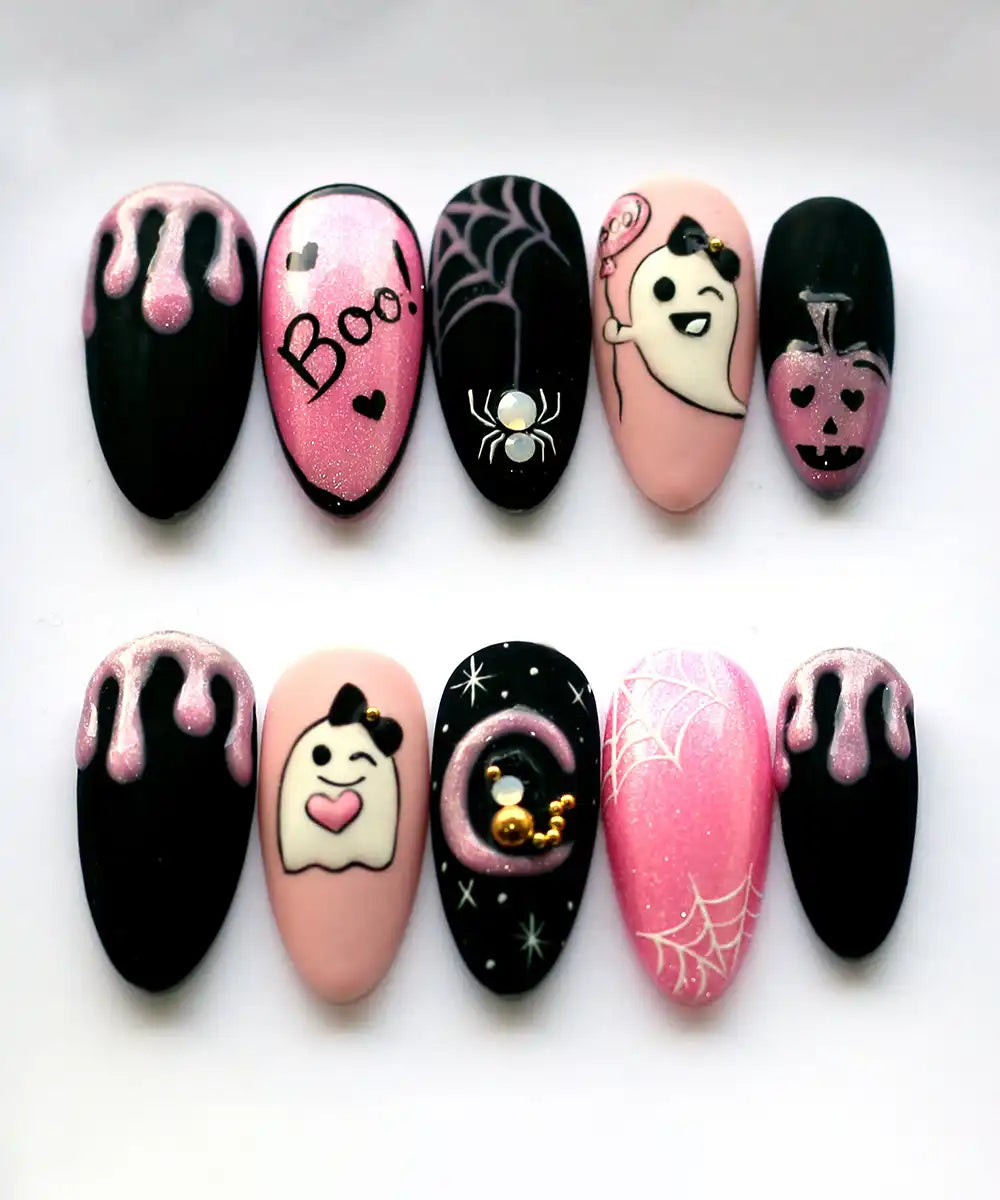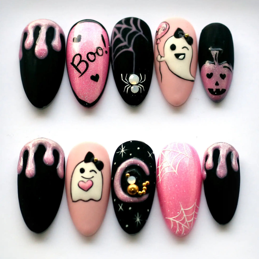 Girly Ghost Pink & Black Halloween Press on Nails - Cute Boo Night Fingernails G71
