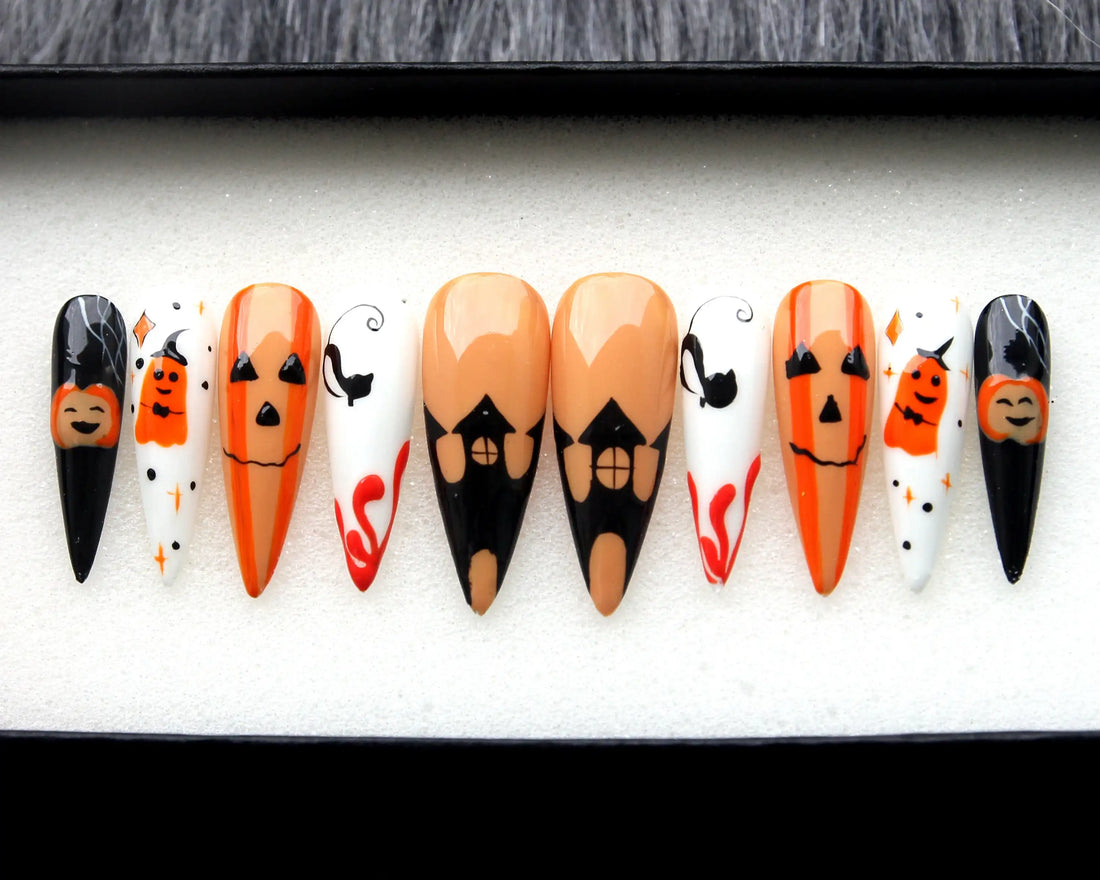Orange Night Halloween Themed Press on Nails - Handmade Fingernails B61