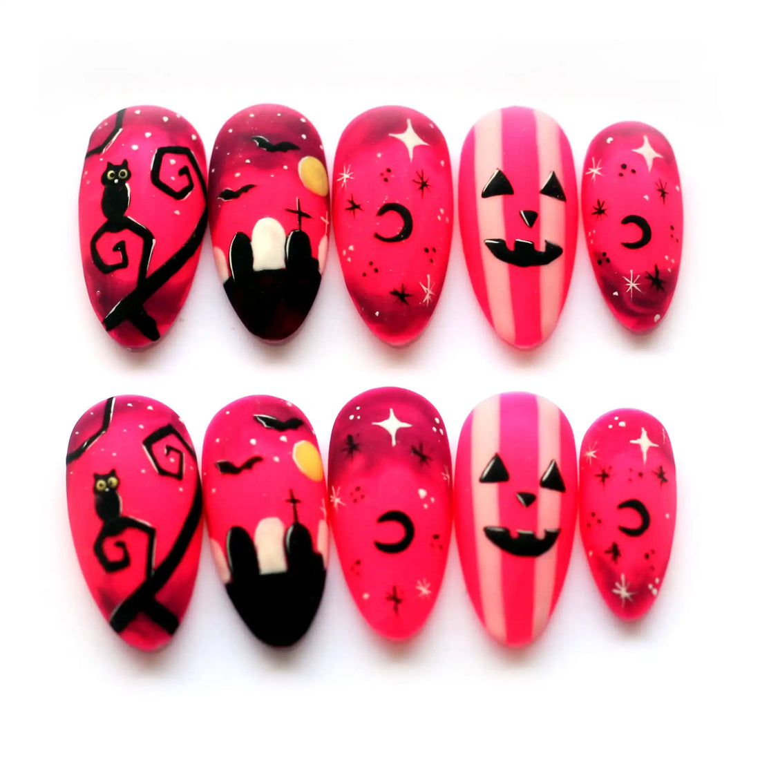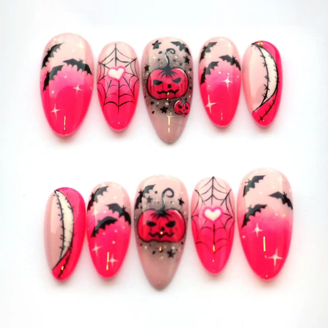 The Pink Night Spooky Halloween Press on Nails - Handmade Fingernails Y30