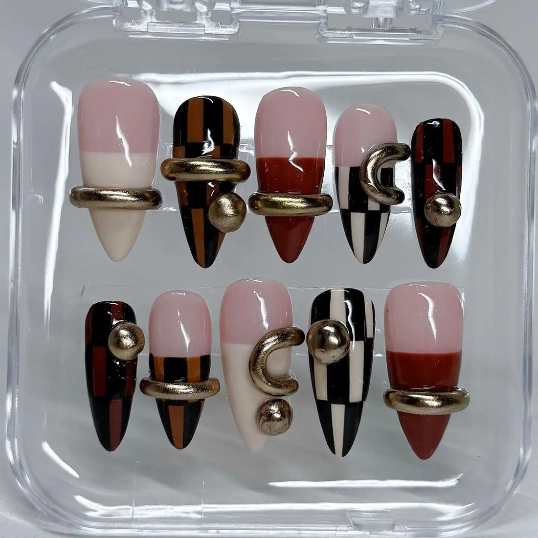 Handmade Abstract Designer Gold Ring Fall Fashion Press on Nails N35