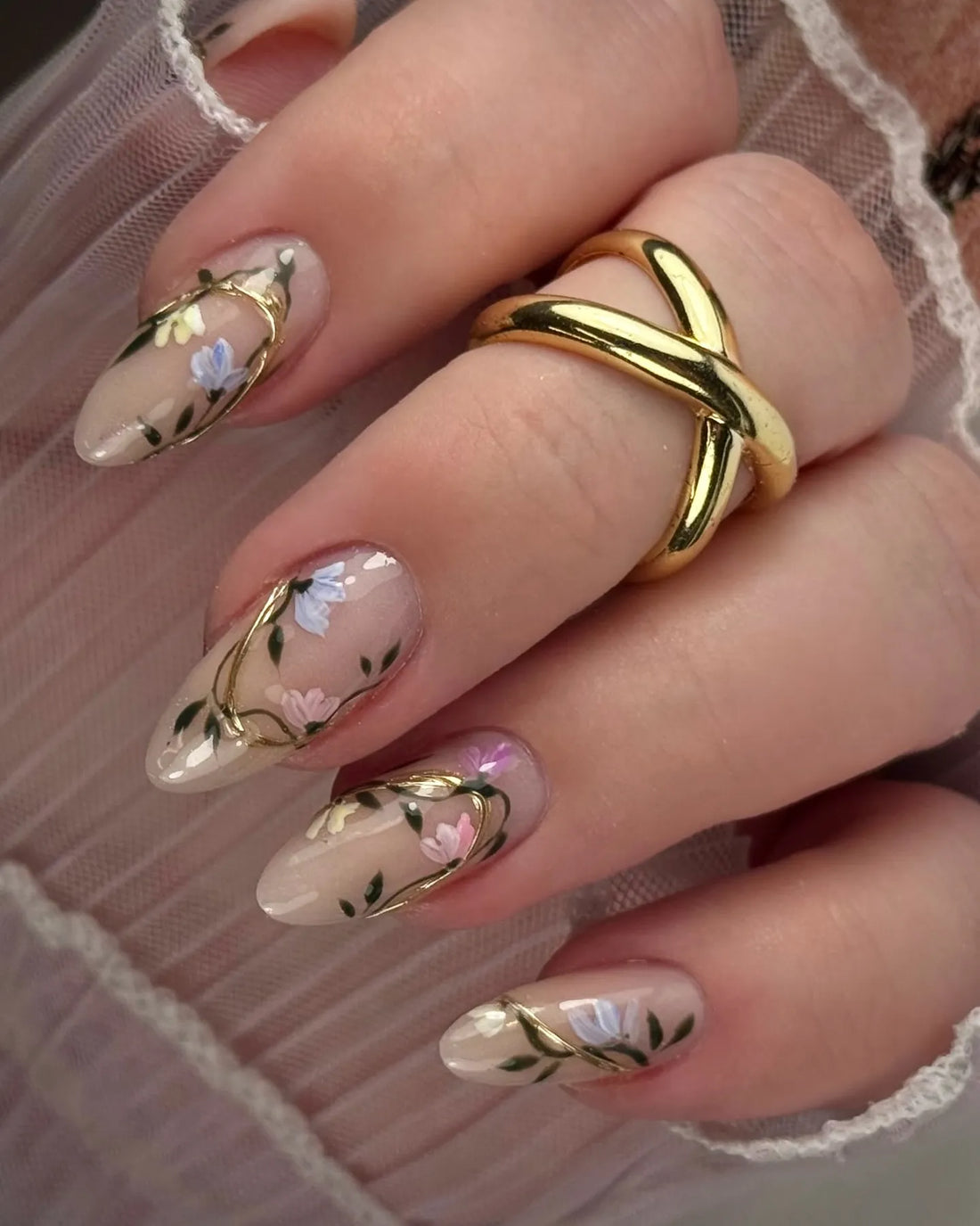 Handmade Romantic Nude Floral Gold Vine Accent Garden Press on Nails G56