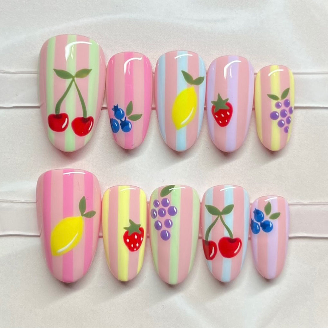 Brighten your look with these handmade press-on nails featuring playful fruit designs on pastel striped...