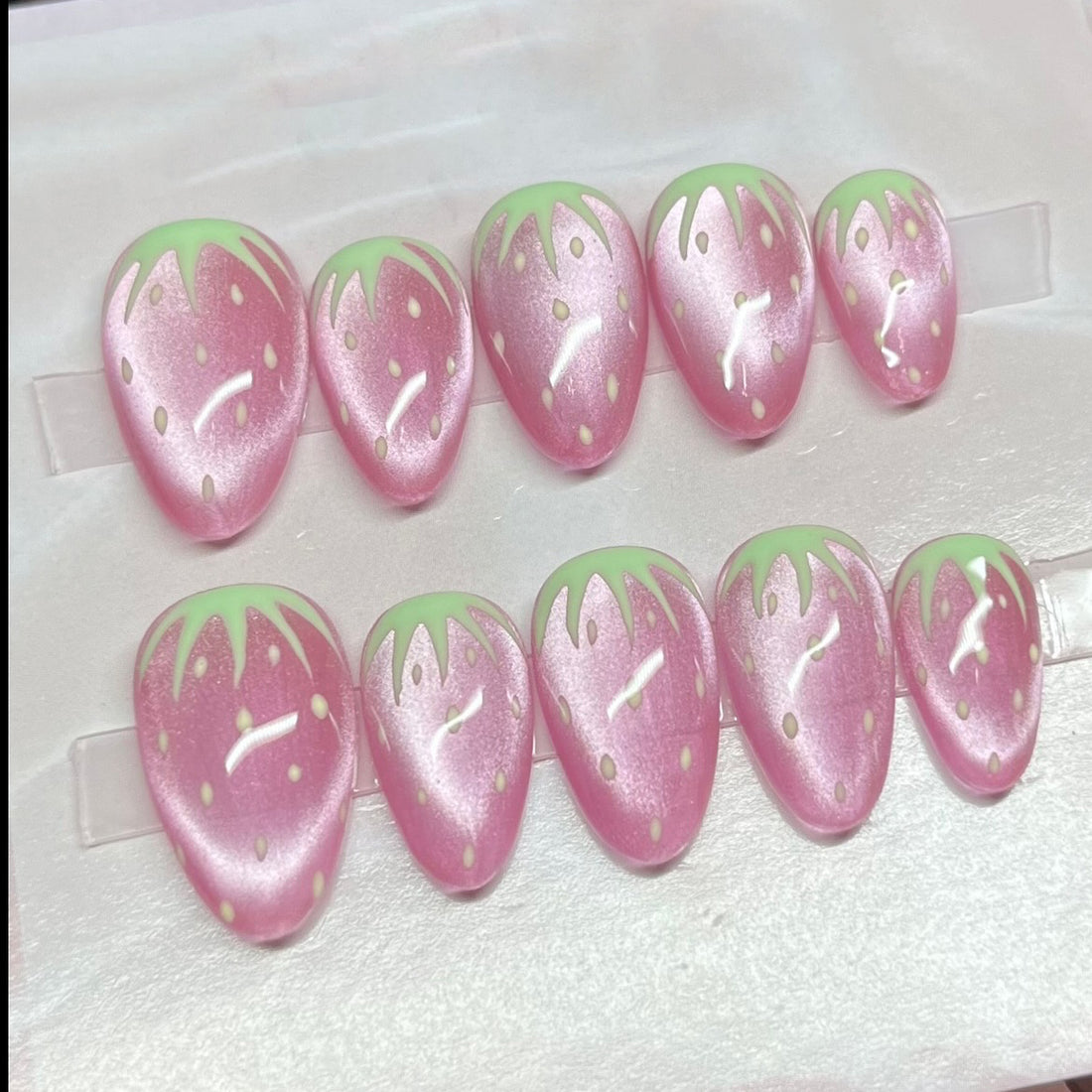 Handmade Shiny Pink Strawberry Fruit Inspired Cute Press on Nails U43
