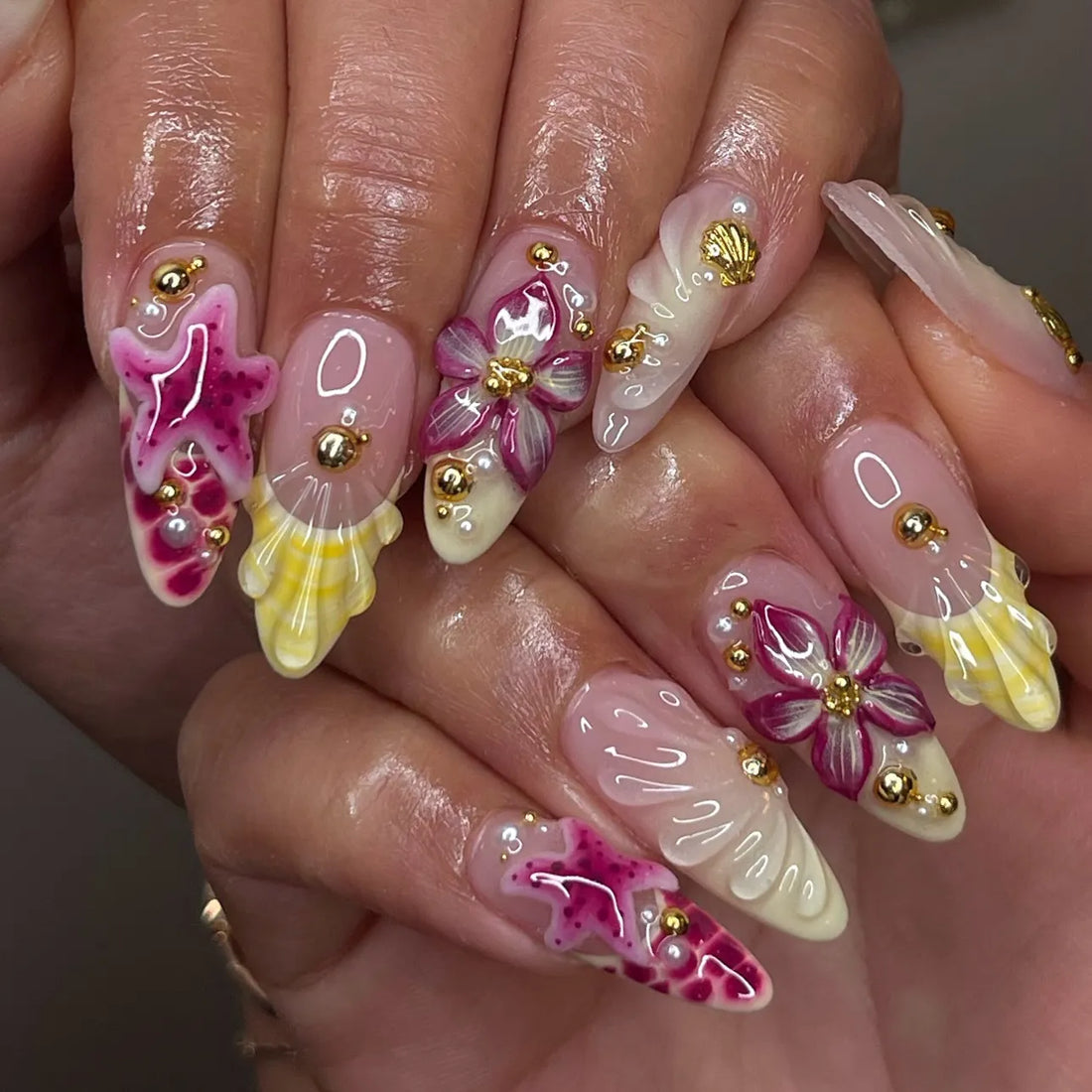 Handmade 3D Seashell Starfish Yellow Pink Ocean Beach Vacation Press on Nails T13