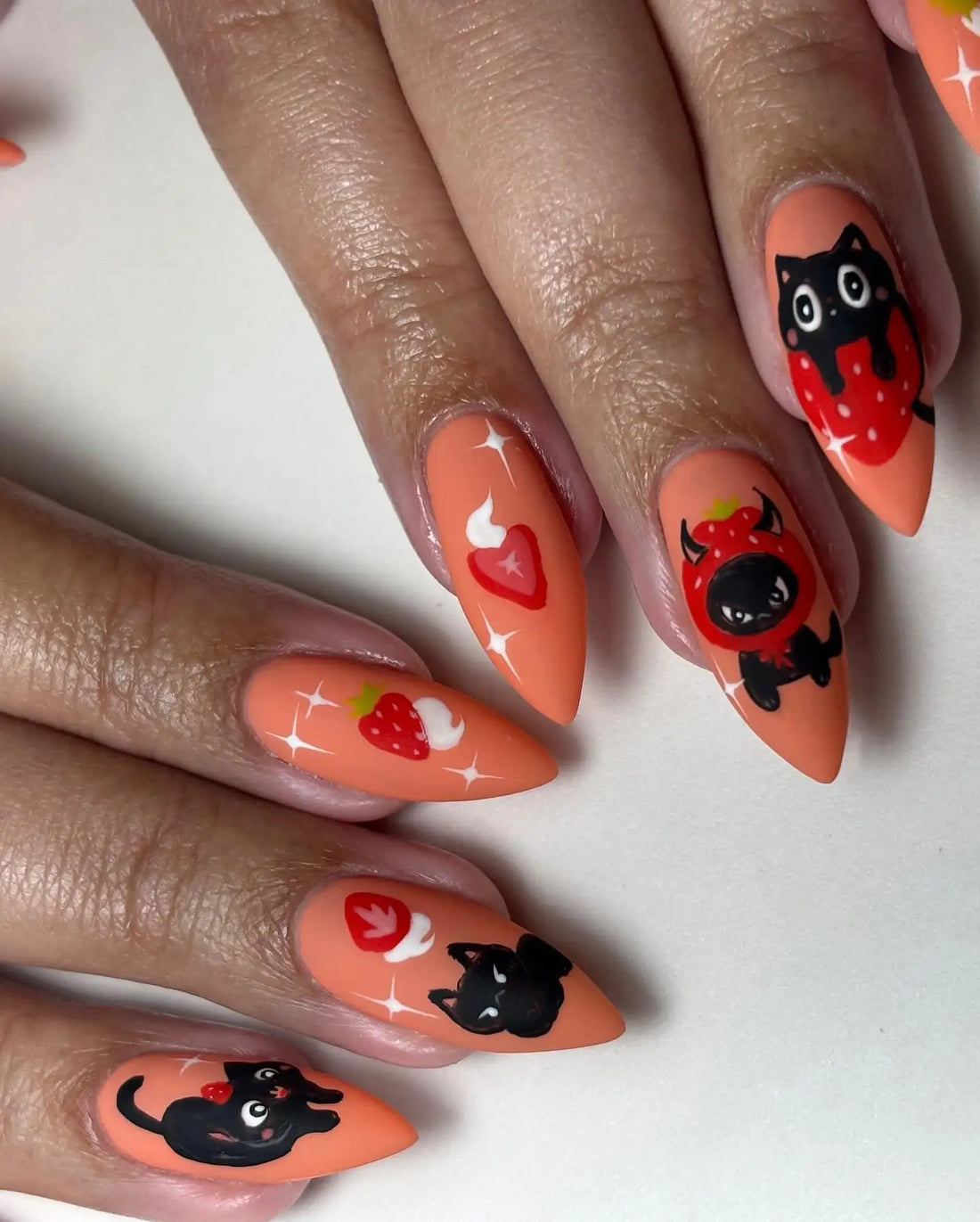 Handmade Kawaii Strawberry Devil Cat Red Sweet Halloween Press on Nails V55