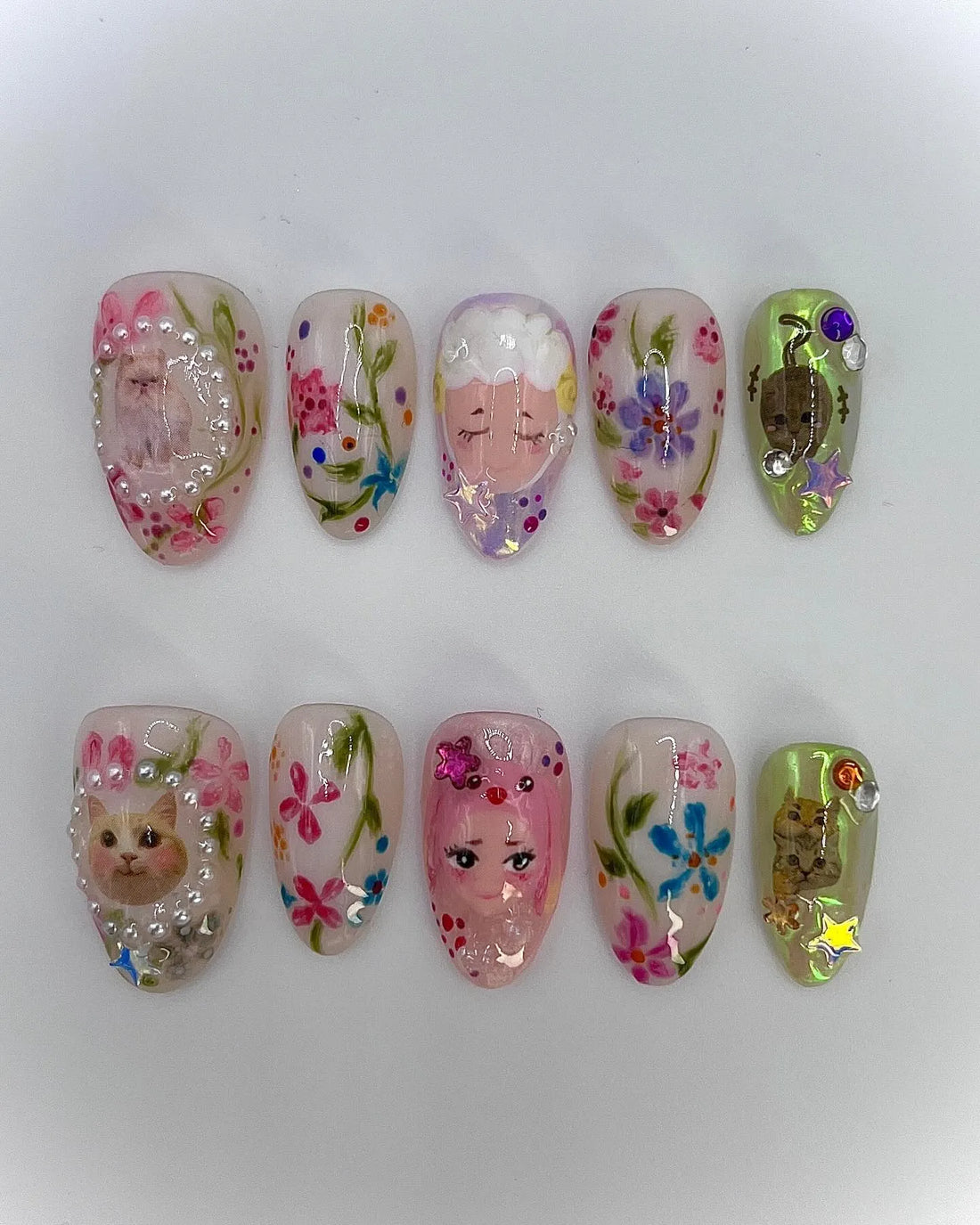 These handmade press-on nails are a dreamy mix of pastel charm and cutenessβfeaturing tiny cats,...