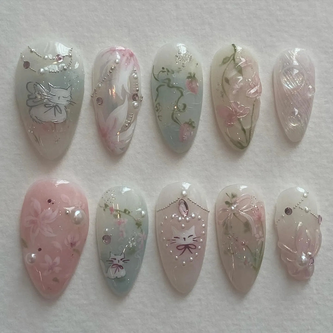 Handmade Cute Cat Kitten Pink Floral Pastel Strawberry Press on Nails X02