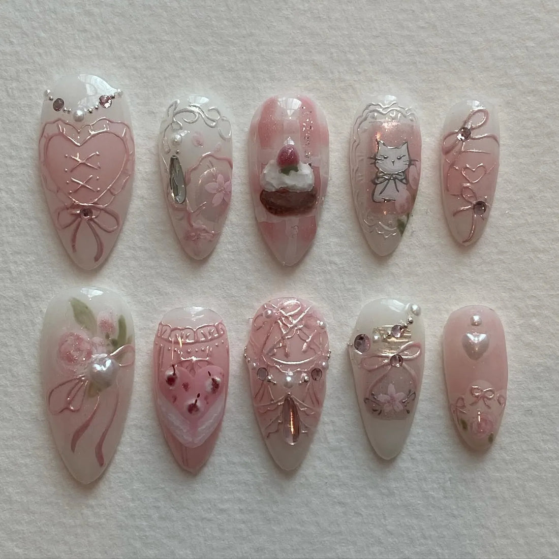 Handmade Pink Cat Cake Lace Bow Heart Sweet Dessert Valentine Press on Nails S88