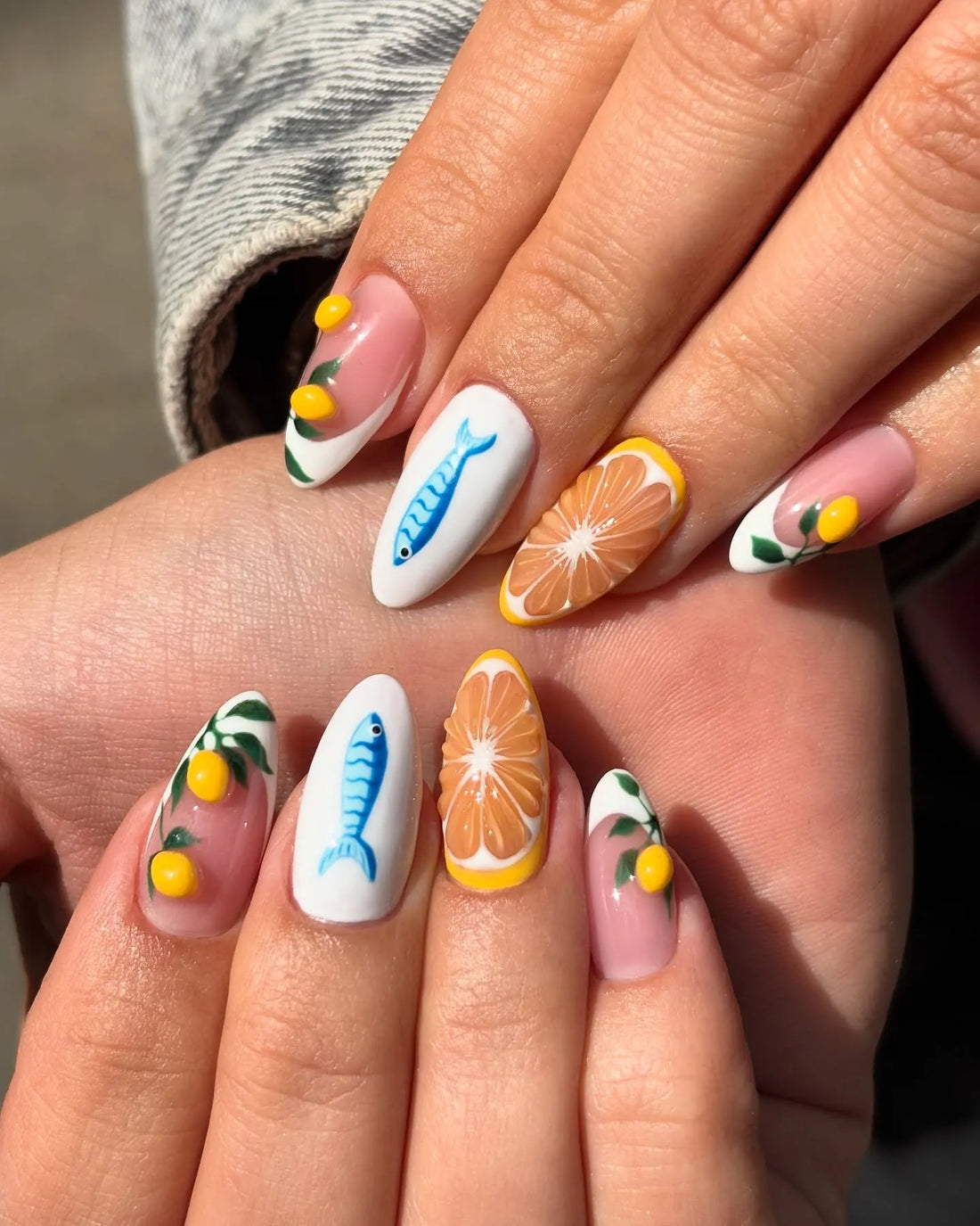 Handmade Yellow Lemon Blue Fish Mediterranean White Press on Nails A43