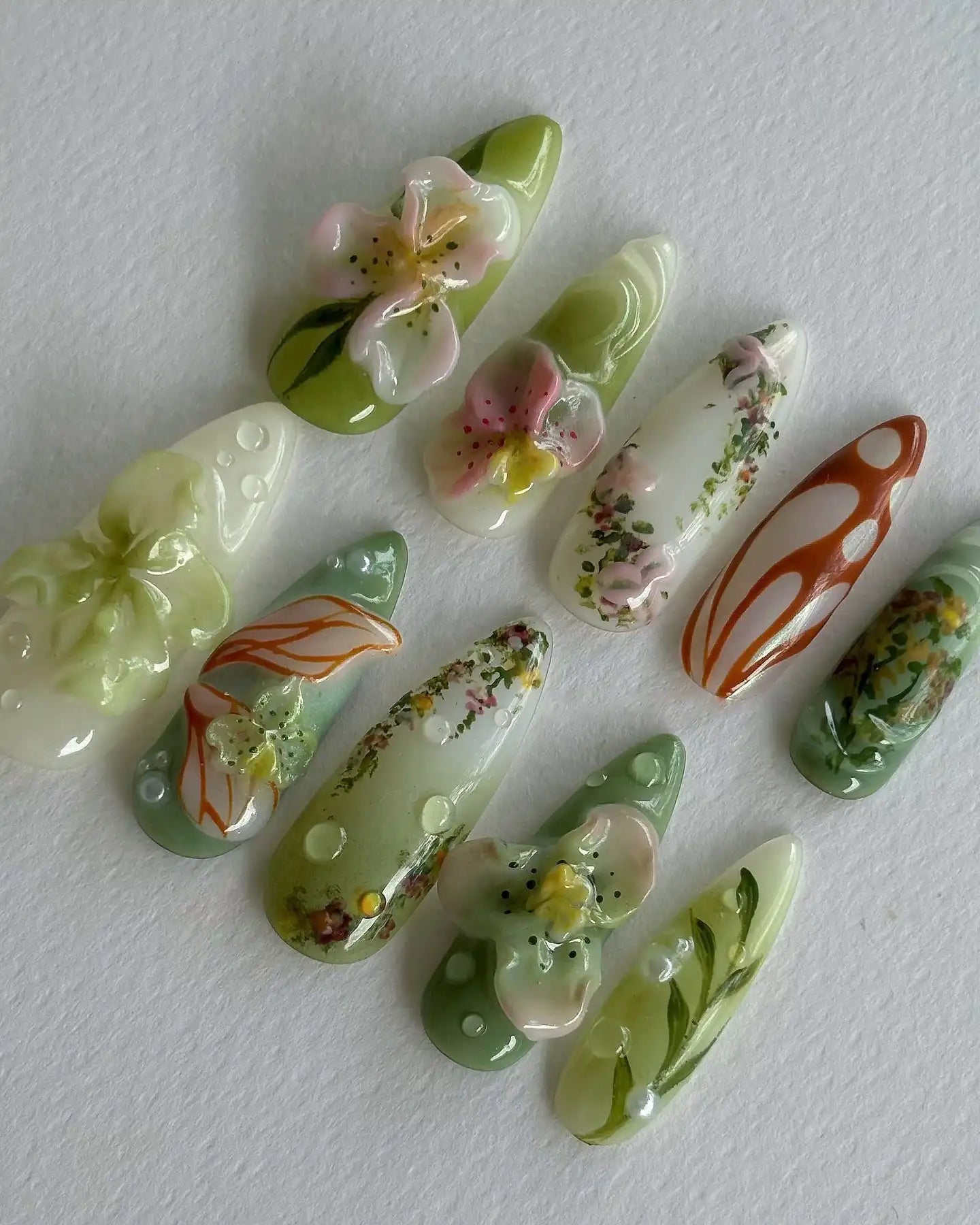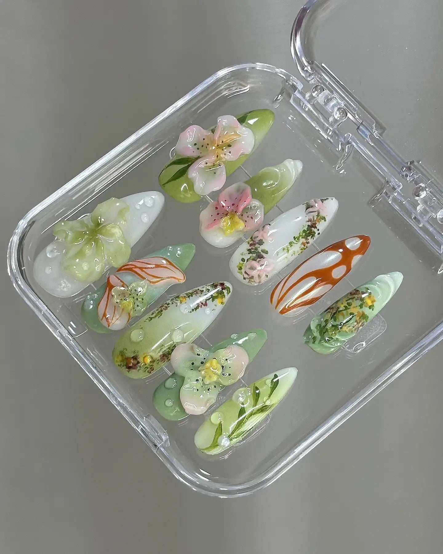 Bring the beauty of a lush garden to your fingertips with these Handmade artistic press-on nails! This reusable set features vibrant 3D floral clusters, delicate painted vines, abstract earthy patterns, and subtle raindrop details. Get customizable designs and choose from many shapes and lengths (like Almond, Oval, Medium, Coffin, or Long). These unique fingernails are perfect for any event or daily wear—especially Spring celebrations, Summer weddings, or achieving a romantic Cottagecore aesthetic. Cultivate your style; order this unique set today!