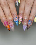 Dare to be different with these Handmade artistic press-on nails! This reusable set is a vibrant mash-up of 3D floral art, colorful seashell sculptures, and playful tiger print accents. Get customizable designs and choose from many shapes and lengths (like Stiletto, Coffin, Almond, Medium, or Long). The high-shine glossy finish guarantees an unforgettable, show-stopping look. Express your unique vibe; order this multicolored set today!