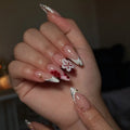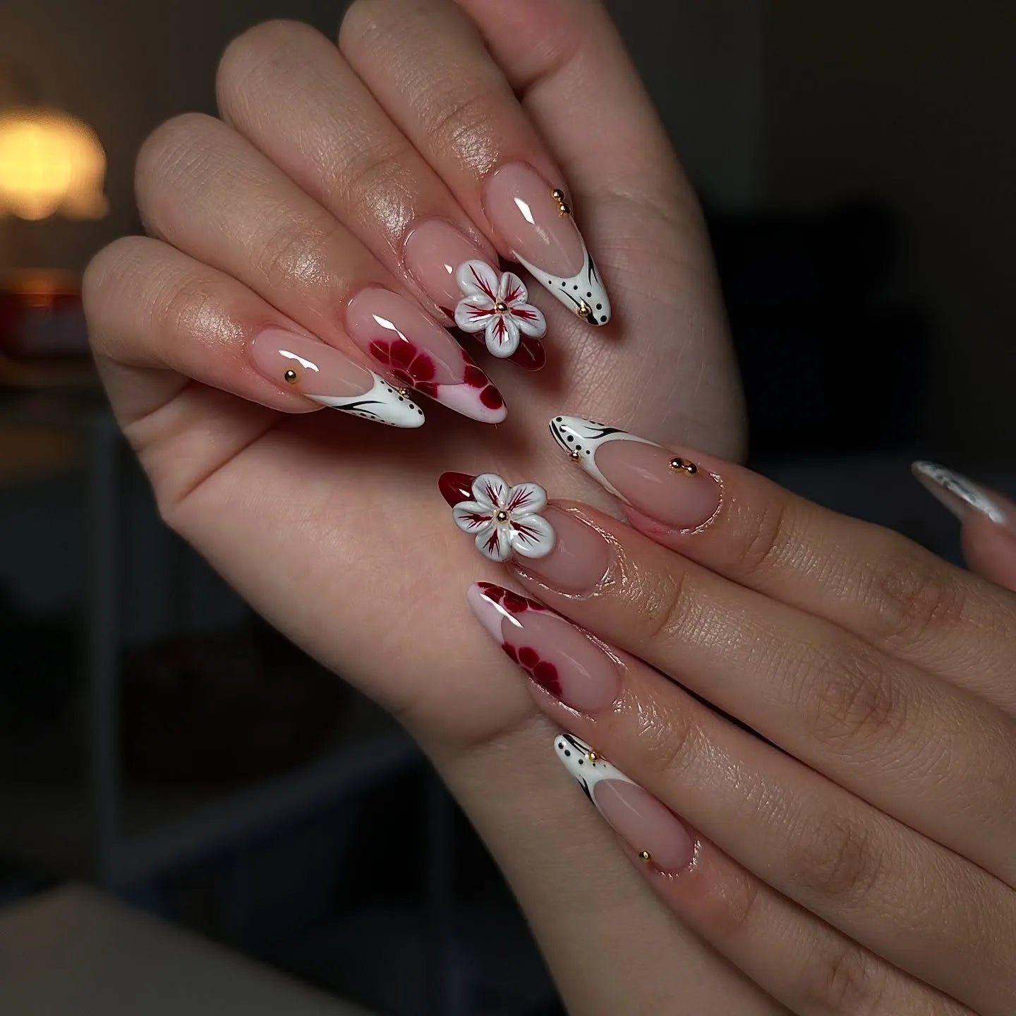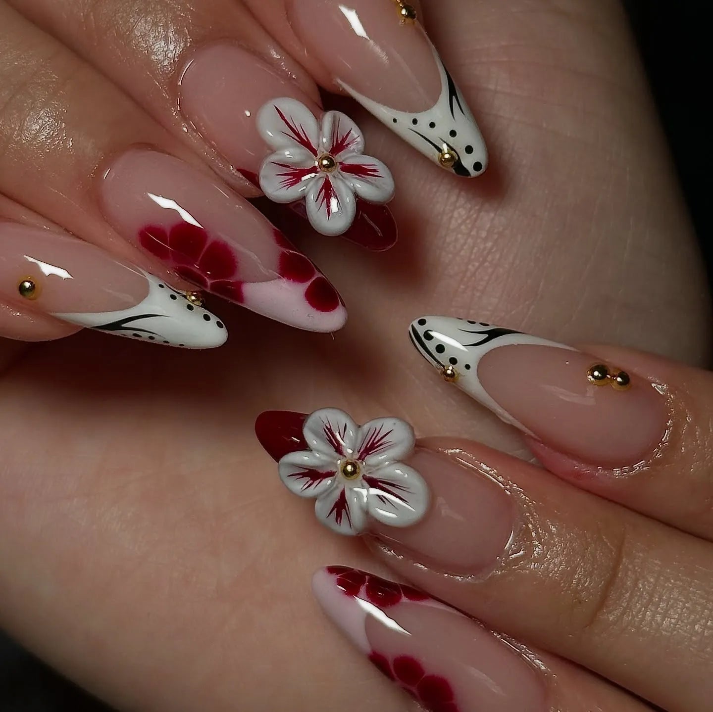 Adorn your fingernails with these luxurious Handmade artistic press-on nails! This reusable set features pristine 3D flowers, striking blood red and white tie-dye effects, and black dot French tip accents. Get customizable designs and choose from many shapes and lengths (like Almond, Stiletto, Coffin, Medium, or Long). These unique nails are perfect for any event or daily wear—especially date nights, sophisticated dinners, or making an elegant fashion statement. Elevate your dramatic flair instantly; order this distinct set today!
