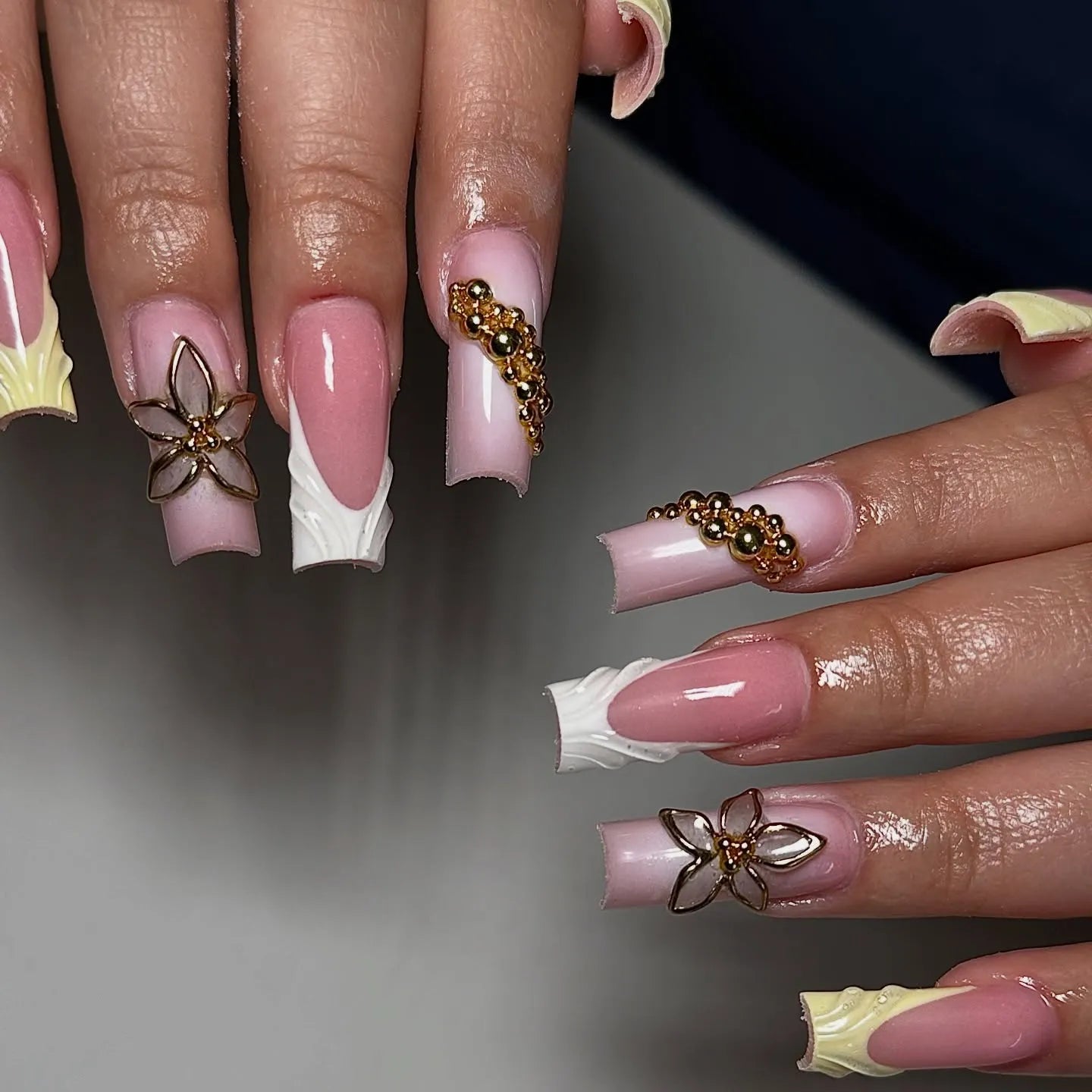 Embrace luxury textures with these Handmade artistic press-on nails! This reusable set features elegant 3D floral accents, unique sculpted white French tips, and bold yellow square tips, all highlighted by rich gold bead chains. Get customizable designs and choose from many shapes and lengths (like Square, Coffin, Medium, Stiletto, or Long). These unique fingernails are perfect for any event or daily wear—especially formal events, cocktail parties, or making a high-fashion statement. Elevate your manicure instantly; order this distinct set today!