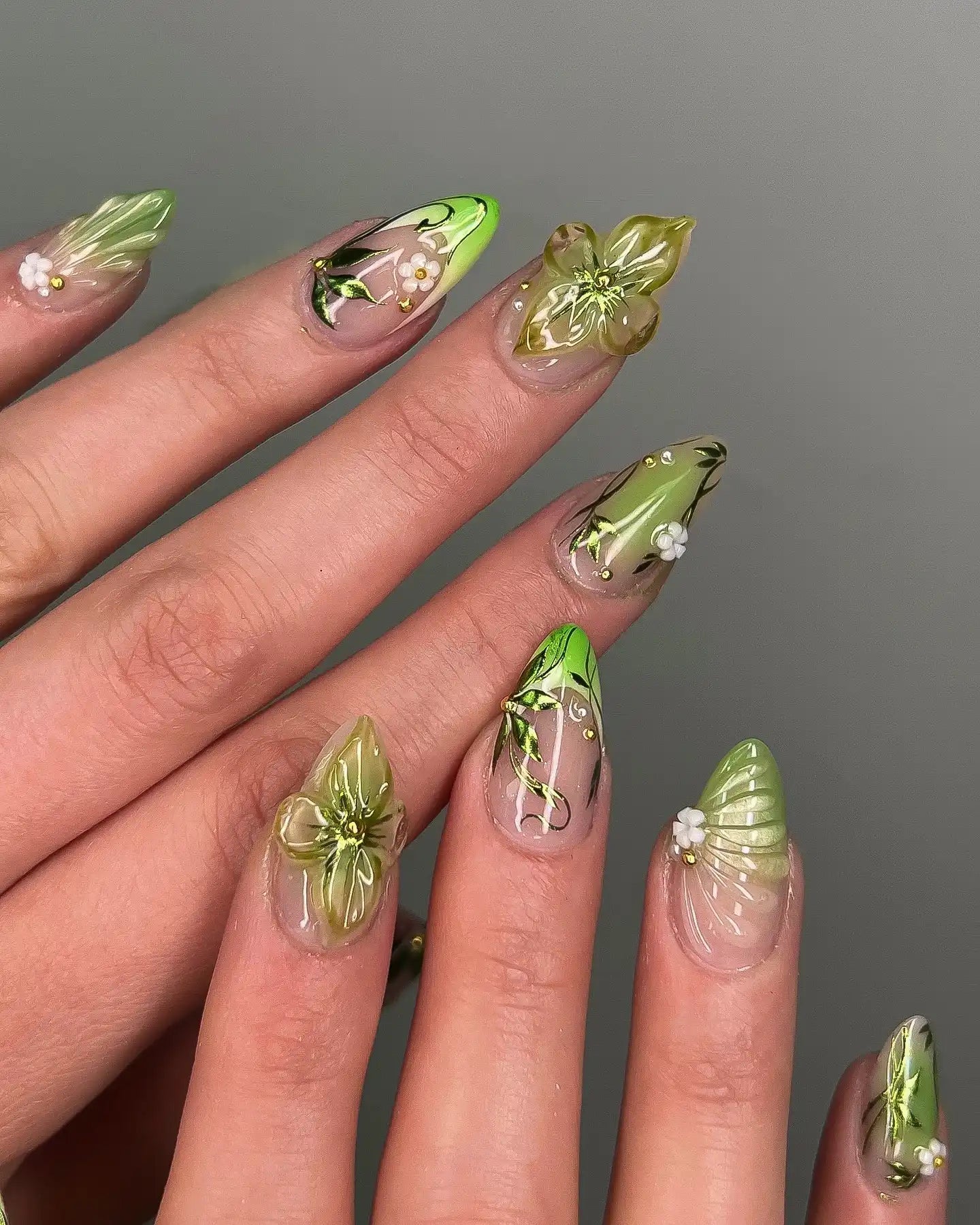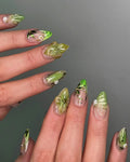 Handmade 3D Green Floral Design Clear Reusable Press on Nails R68