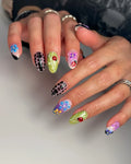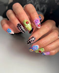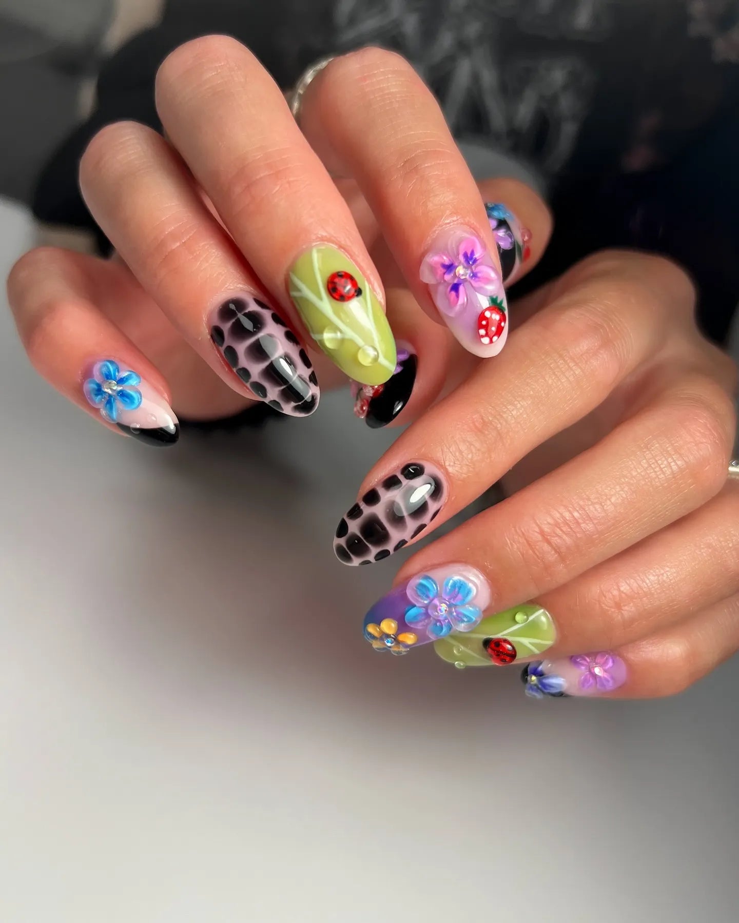 Step into a whimsical enchanted garden with these intricate handmade press-on nails. This eclectic set features vibrant hand-painted ladybugs, realistic 3D flowers in shades of purple and blue, and charming cherry accents over a mix of lime green and classic black-and-white patterns. These reusable fingernails offer a highly detailed, customizable look with a professional glossy finish. Bring the magic of a spring garden to your fingertips with this playful and artistic set today!