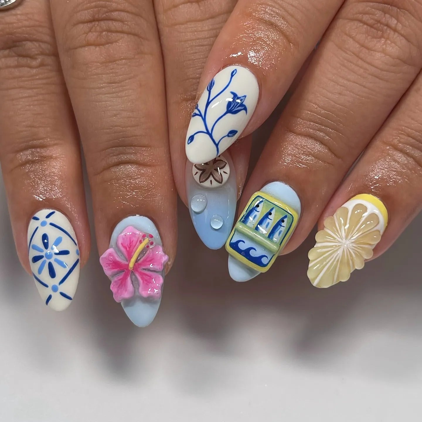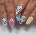 Infuse your style with the carefree spirit of summer using these reusable handmade fingernails. The cheerful 3D lemon, hibiscus, and delicate blue tile patterns make these customizable designs perfect for a beach trip, resort wear, or any event or daily wear. They come in many lengths like Short, Medium, or Long. Brighten up your day instantly! Add this vibrant set to your cart now.