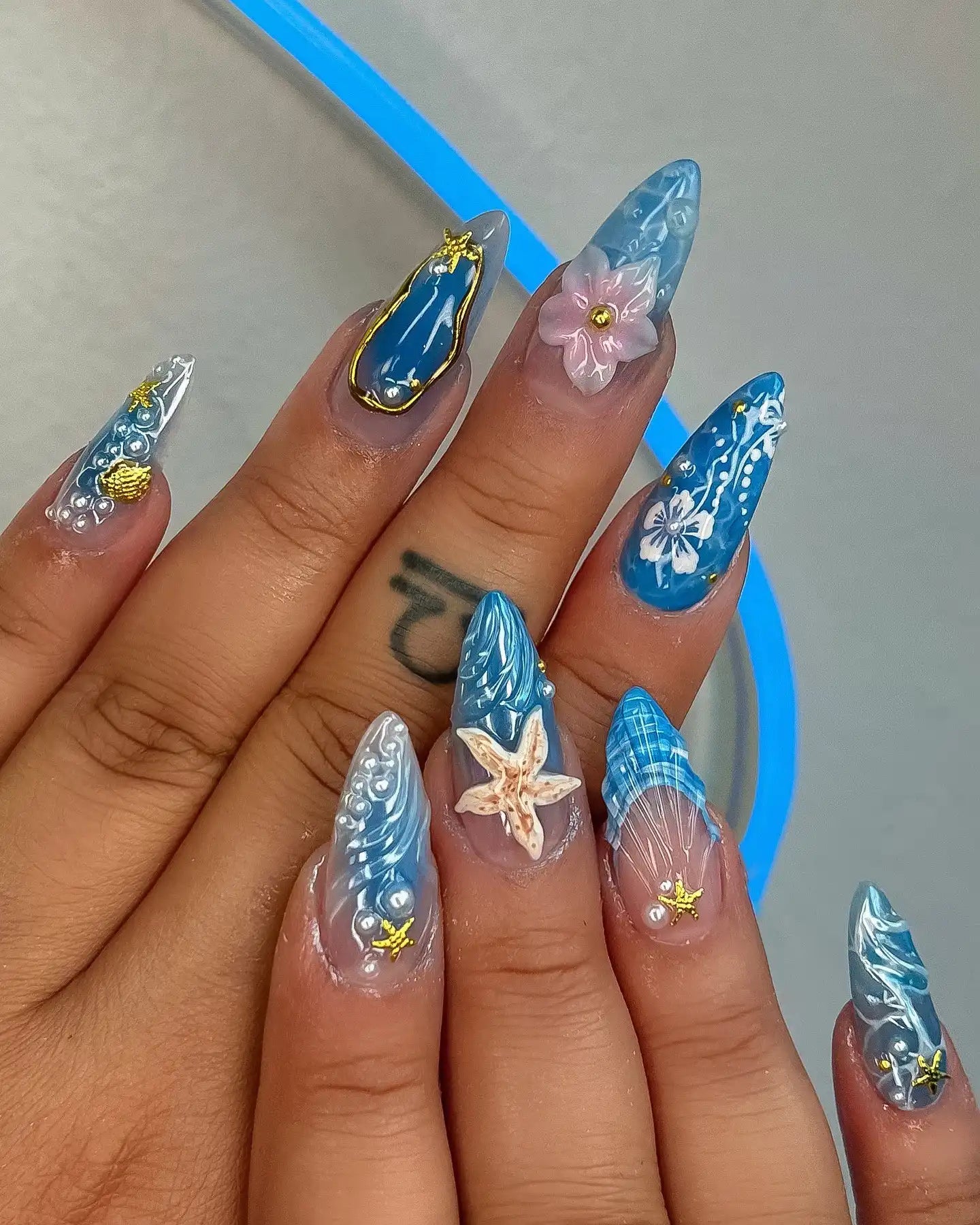 Handmade 3D Ocean Bloom Starfish Seashell Blue Summer Reusable Press on Nails P70