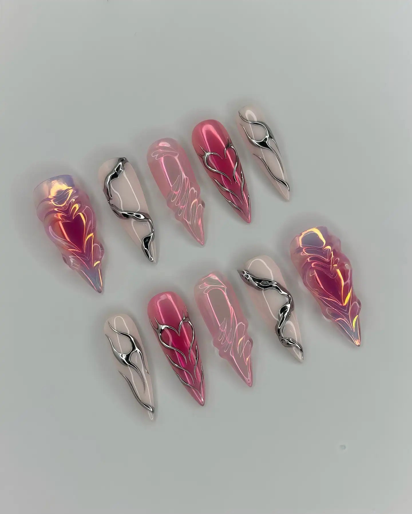 Unleash your aesthetic with this incredible Handmade press-on nail set! Featuring sculpted 3D chrome hearts, metallic snake accents, and iridescent pink polish, these customizable designs are reusable and boast a bold glossy finish. Perfect for any event or daily wear, especially festivals, concerts, or date nights. Available in many shapes and lengths—like Short, Medium, or Long, and shapes like Almond, Coffin, or Stiletto—these trendy fingernails offer unmatched, edgy style. Transform your manicure and shop this unique set now!