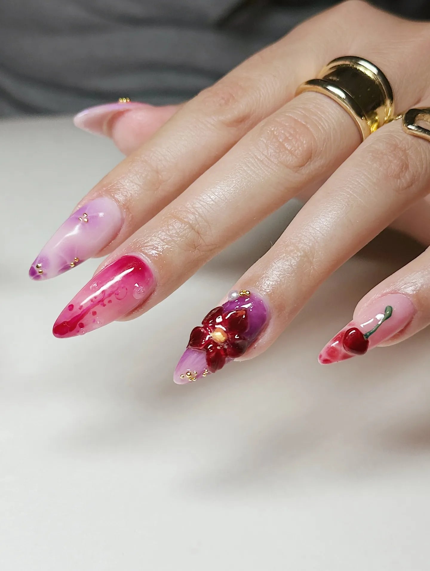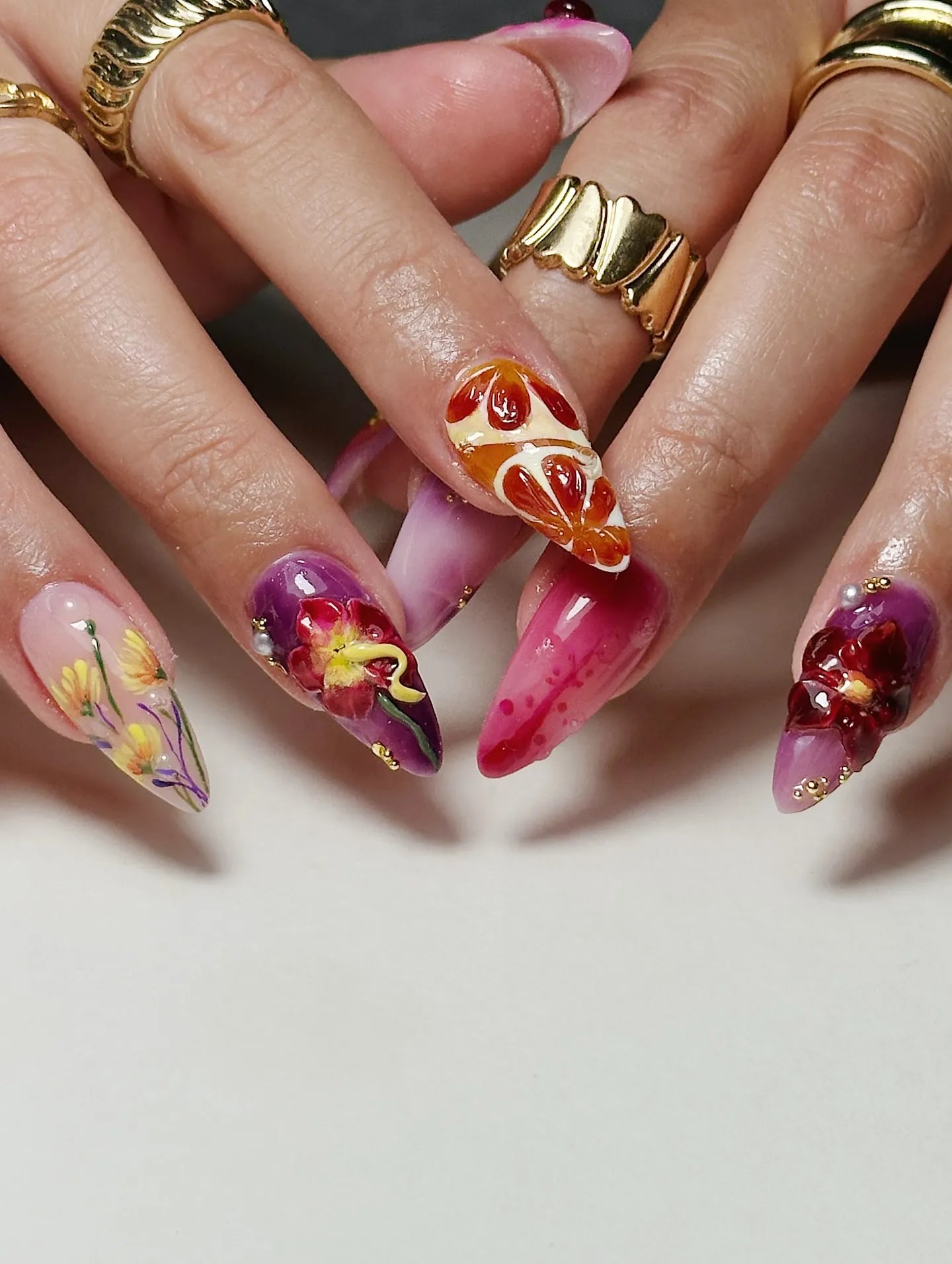 Handmade 3D Purple Floral Art Gold Wave Chrome Pearl Press on Nails U77