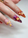 Elevate your aesthetic with these exquisite handmade press-on nails. Featuring soft purple floral art, luxurious 3D blossoms, and striking gold wave chrome accents, these reusable nails provide customizable beauty for any special event. Their professional glossy finish makes them a standout choice for weddings or celebrations. Bring a touch of regal elegance to your manicure with this gold and purple set today!
