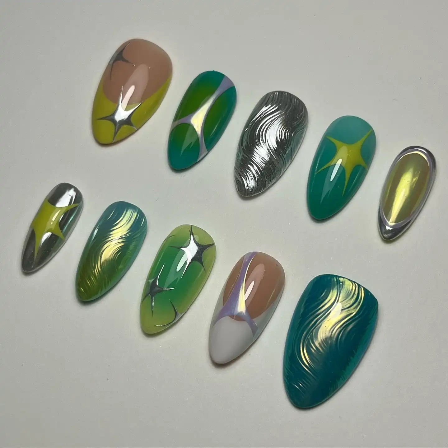 Launch your look with these handmade, reusable press-on nails! Experience a bold, futuristic style instantly. Featuring vivid greens and silvers with striking chrome swirls, metallic accents, and star patterns with a high-shine glossy finish, these nails are perfect for any event or daily wear. Shop now for a major statement!