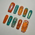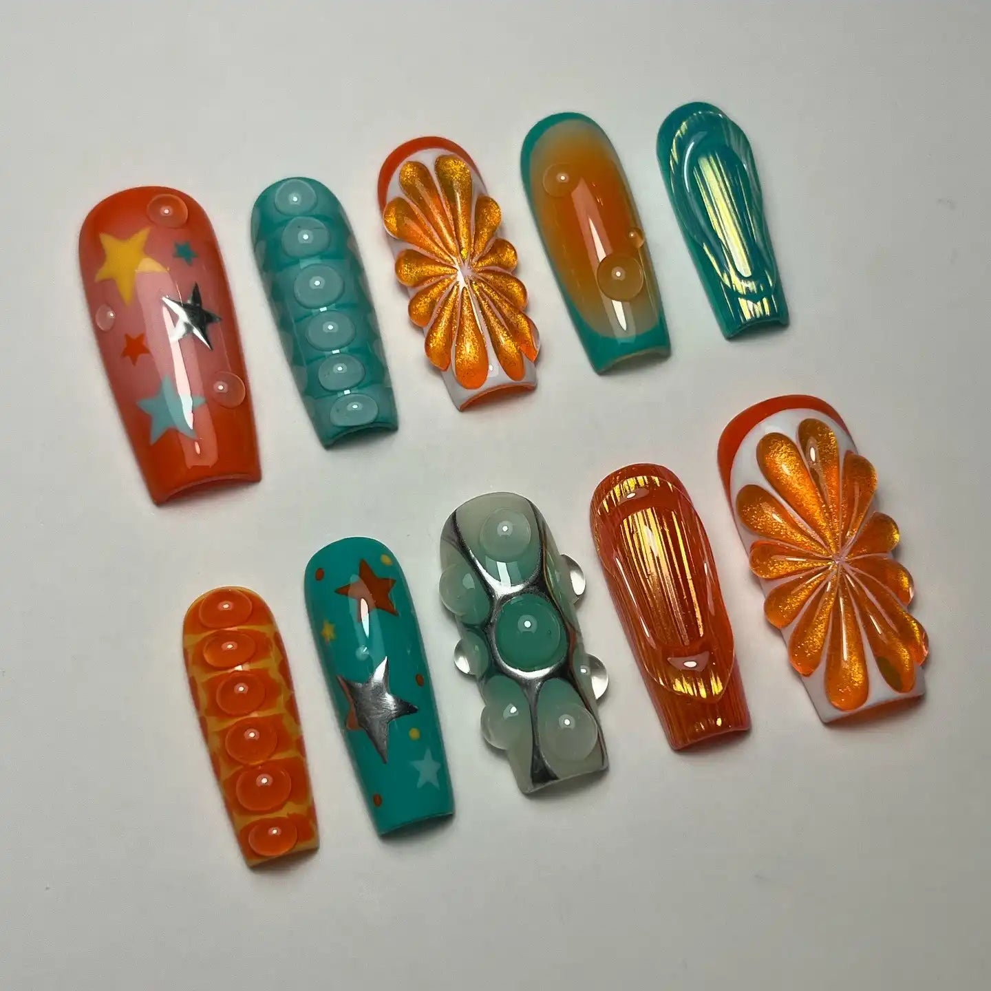 Unleash your inner mermaid with these handmade, reusable press-on nails! Experience effortless style with an instant, vibrant look. Featuring brilliant orange, teal, and a captivating glossy finish with 3D water drops and starfish/citrus slices, these nails are perfect for any event or daily wear. Their bold, unique artistry sets them apart. Available in many customizable designs, they transform your fingernails in minutes. Get yours now and make a splash!