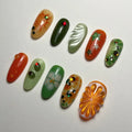 Unveil your style with these handmade, reusable press-on nails! Enjoy a salon-quality look instantly and affordably. Featuring vibrant citrus oranges, rich greens, and abstract designs with a bright glossy finish, these nails are perfect for any event or daily wear. Their unique, gem-accented artistry makes them stand out. Available in many customizable designs, lengths (Short, Medium, or Long), and shapes (like Almond or Coffin), they deliver stunning fingernails in minutes. Shop now and get ready for compliments!
