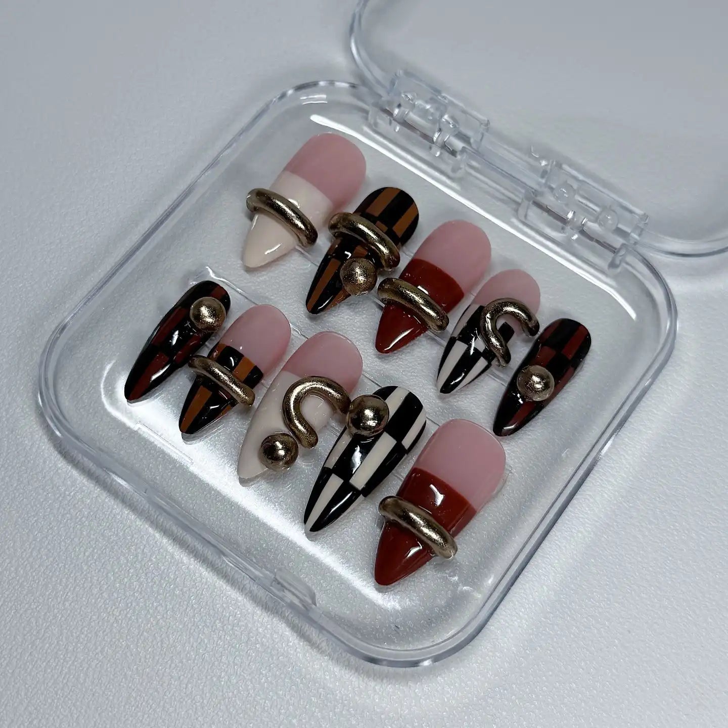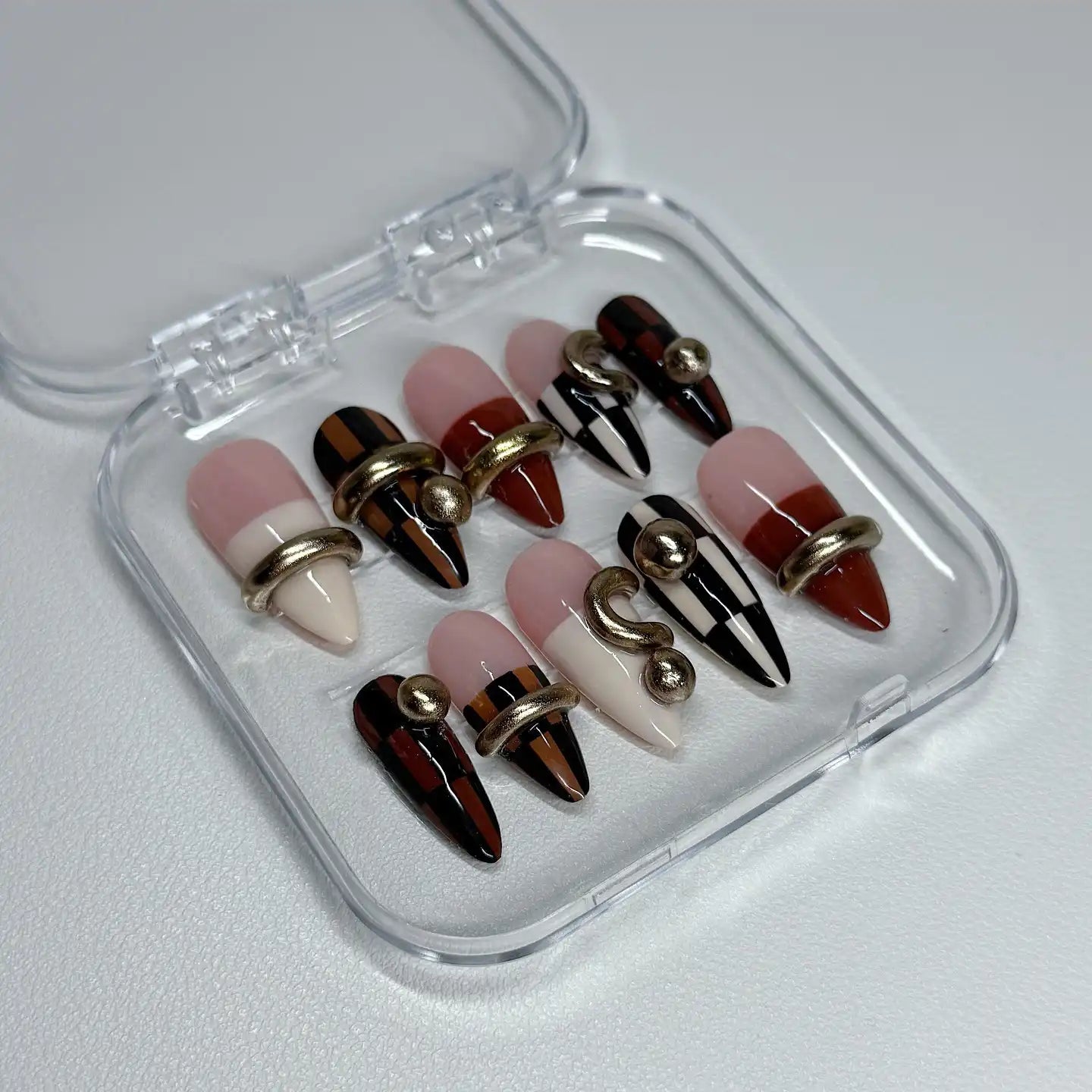 Make a bold statement with these striking handmade press-on nails, featuring mixed geometric patterns like checkers and stripes, complete with gold 3D hardware and a stunning glossy finish. These unique fingernails are a perfect accessory for fashion week, costume parties, or any event or daily wear. Available in customizable designs across many shapes, including Square and Stiletto. Embrace your extraordinary style today!