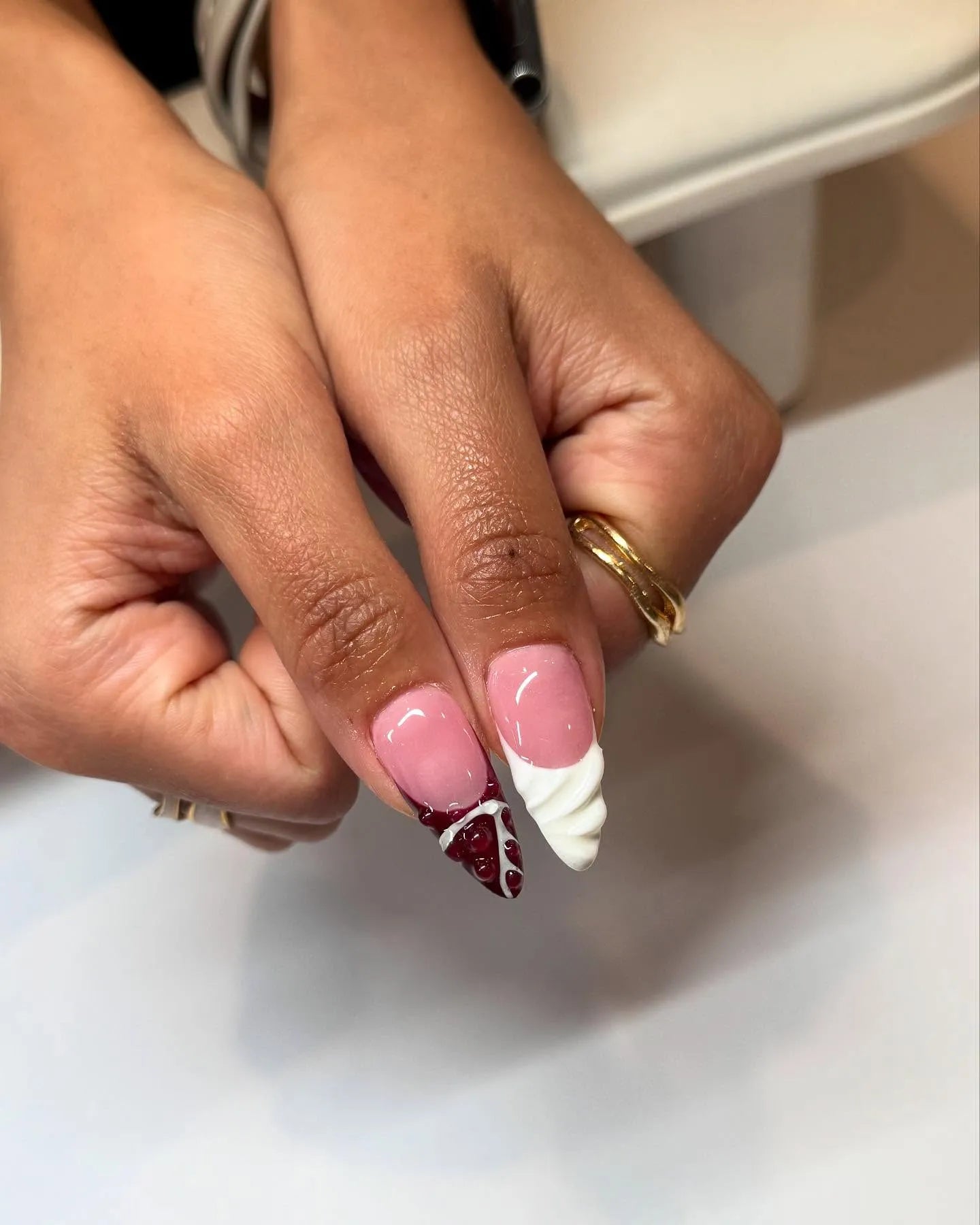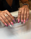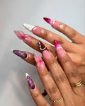 Capture elegance with this exquisite set of handmade press-on nails. Featuring rich berry ombres, realistic water droplet accents, and a flawless glossy finish, this design is truly unique. They are reusable and come in customizable designs and lengths like Medium, Long, or Short, and shapes such as Stiletto or Coffin. Perfect for a holiday event or any event or daily wear. Make these artistic fingernails yours today!
