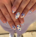 Embrace a soft, romantic look with these Handmade delicate press-on nails. This reusable set features dainty hand-painted blue florals, subtle white lace borders, and a sweet center bow accent, all over a natural nude base. Get customizable designs and choose your preferred shape and length. The crisp glossy finish provides a fresh, polished look. Start your fairytale manicure now!