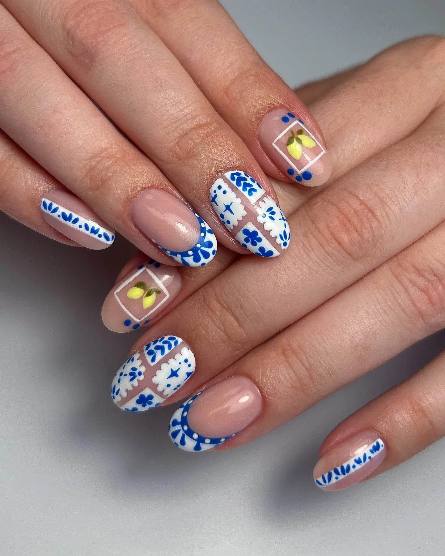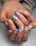 Transport yourself to the Amalfi Coast with these exquisite handmade press-on nails. This set features intricate hand-painted blue Mediterranean tile patterns and delicate yellow lemon accents framed in crisp white borders. These reusable fingernails offer a customizable, sophisticated aesthetic with a mix of full-pattern designs and elegant floral French tips. Embrace the vibrant spirit of the Mediterranean with this refreshing tile and lemon set today!