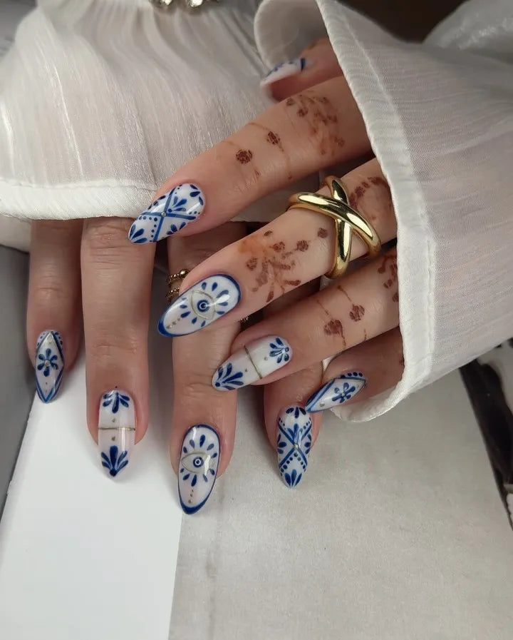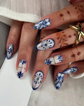 Handmade Blue White Portuguese Azulejo Tile Evil Eye Gold Accent Fake Nails K30