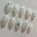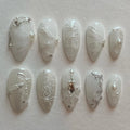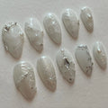 Make a sophisticated statement with these stunning handmade press on nails, featuring pure white polish, delicate silver accents, and shimmering pearl chains. These reusable designs offer customizable designs and a beautiful high-shine finish, making your fingernails perfect for any event or daily wear. They come in many shapes and lengths, including Medium, Oval, or Almond. Ideal for brides, formal events, or anyone who loves timeless, elegant, and refined style. Claim this luxurious and unique set and bring high glamour to your fingertips!