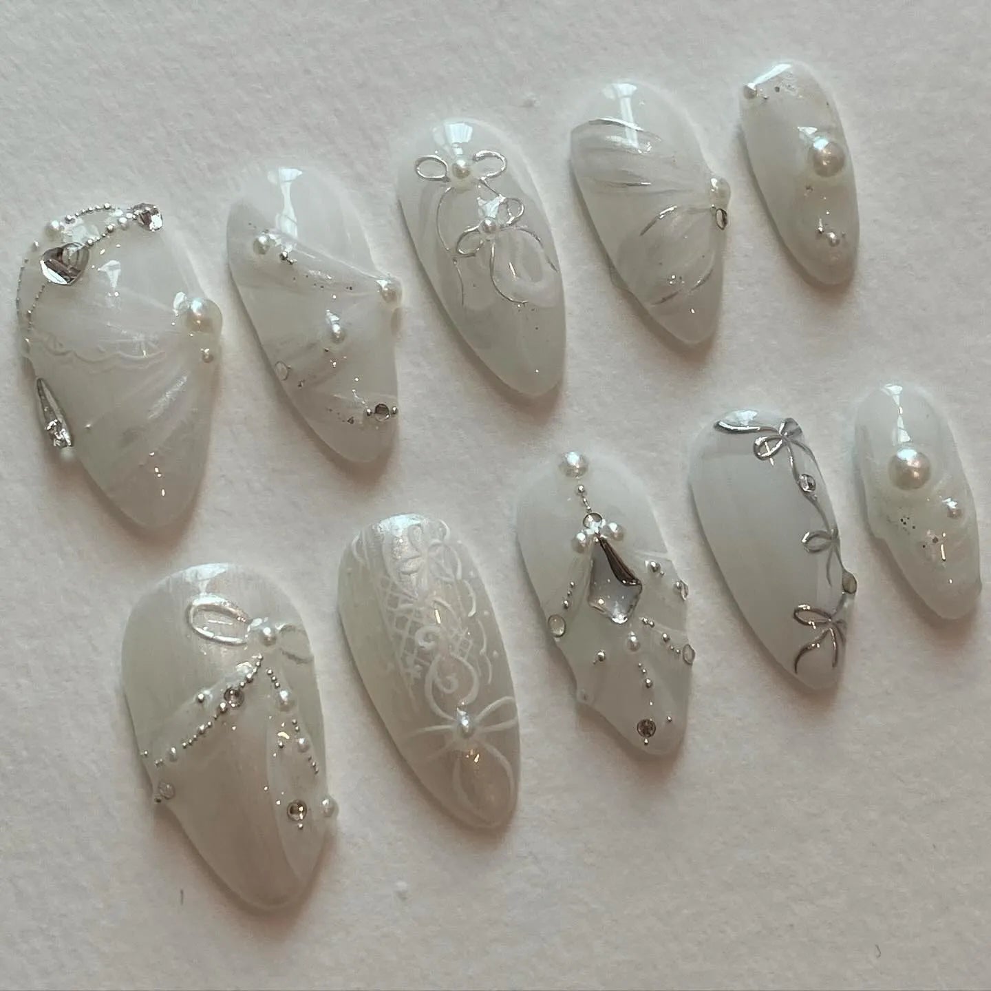 Handmade Bridal White Silver Swirl Bow Pearl Chain Luxury Press on Nails S84