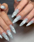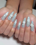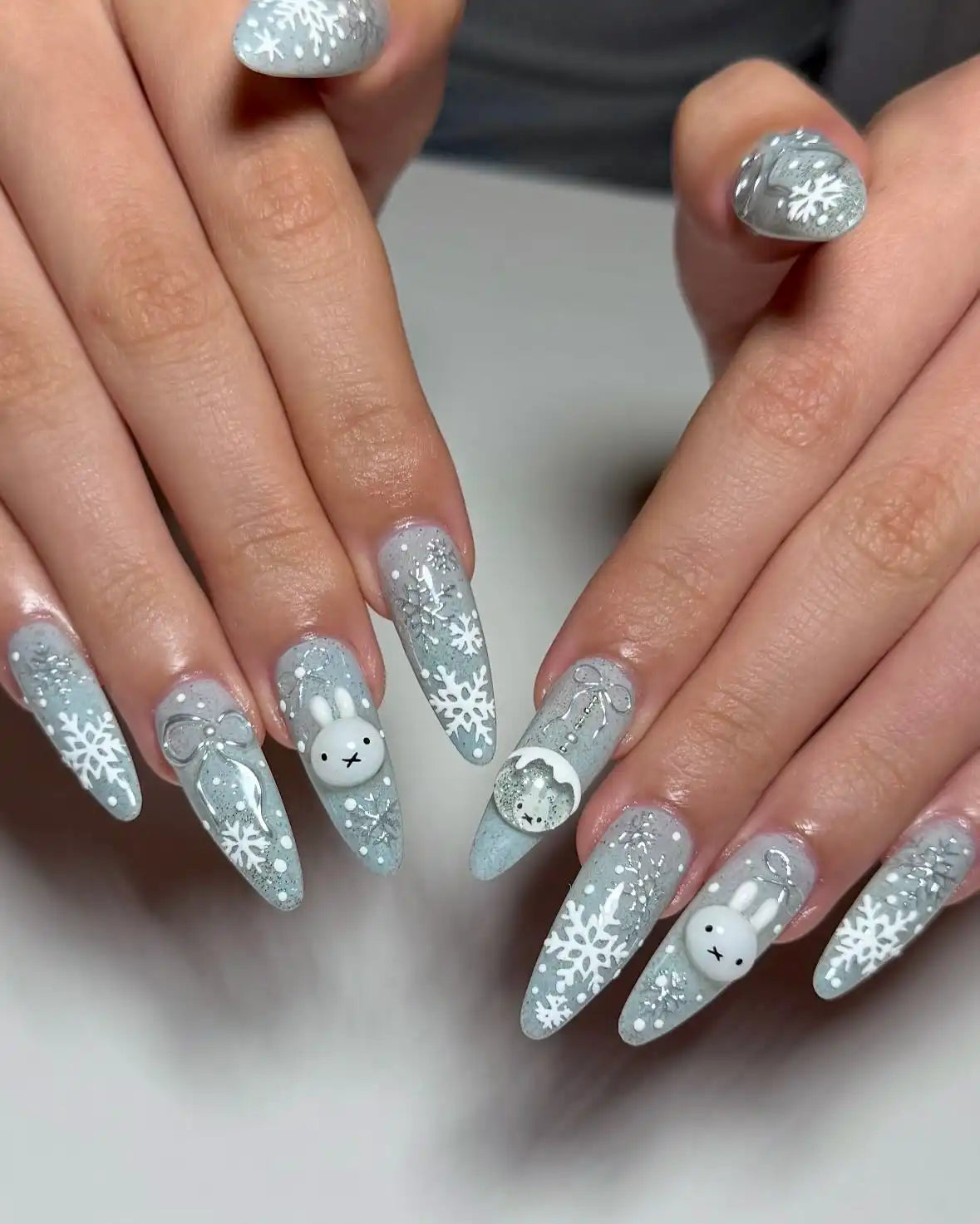 Handmade press-on nails featuring adorable 3D bunnies, white snowflakes, and silver glitter for a cozy winter charm. Reusable and customizable in shapes and lengths like Almond, Coffin, Oval, Square, or Stiletto. Perfect for Christmas, holiday parties, or cute daily wear. Add a playful frosty sparkle to your style—order these charming nails today!