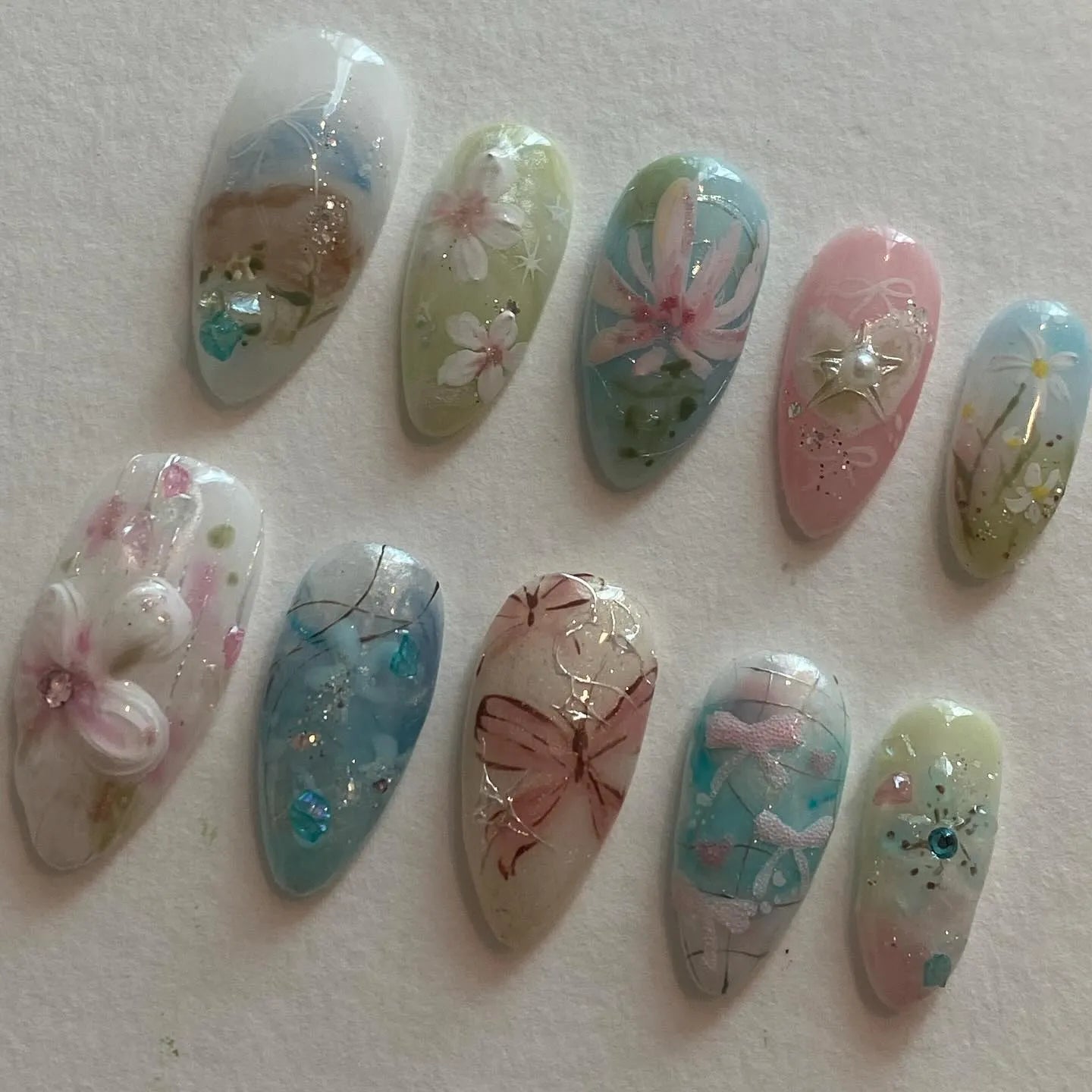 Handmade Butterfly Nature Scene Pastel Floral Spring Press on Nails Y37