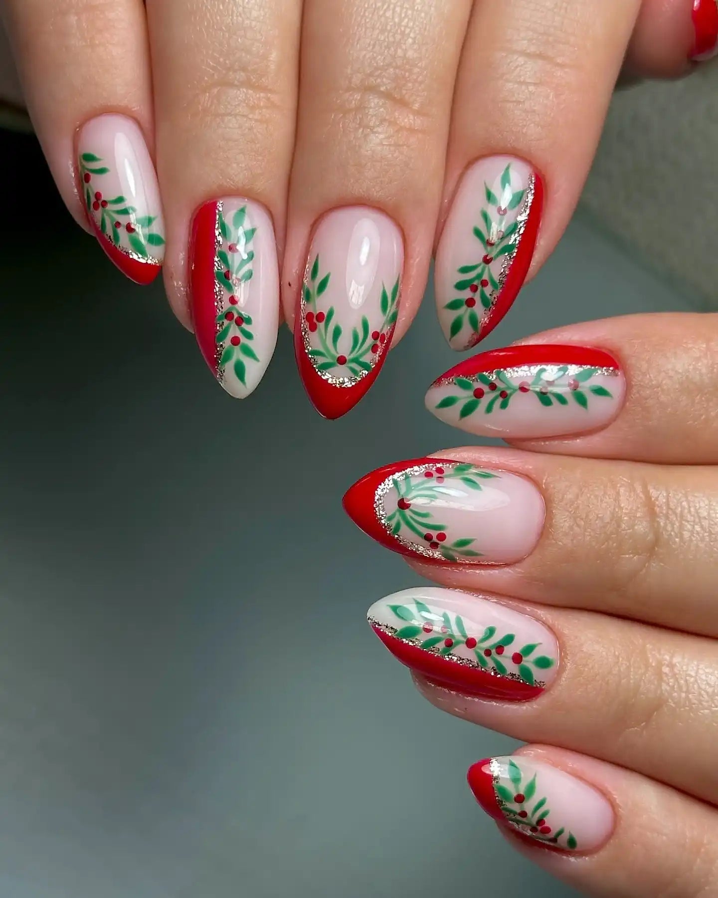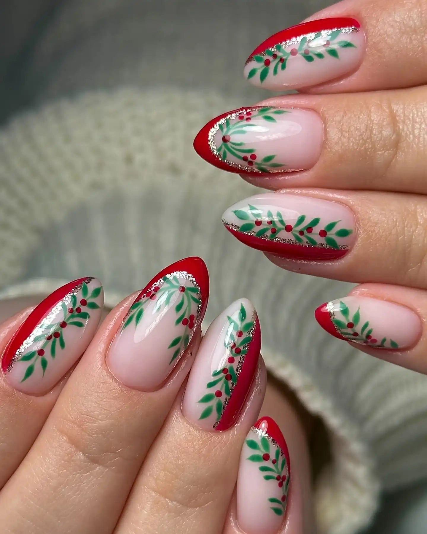 Celebrate the holidays with these delicate handmade press-on nails! They feature festive holly berries, intricate leaves, and red French tips with a sparkling glitter accent. Reusable and customizable, these unique fingernails are perfect for holiday parties or daily wear. Available in various shapes and lengths. Get your festive set now!