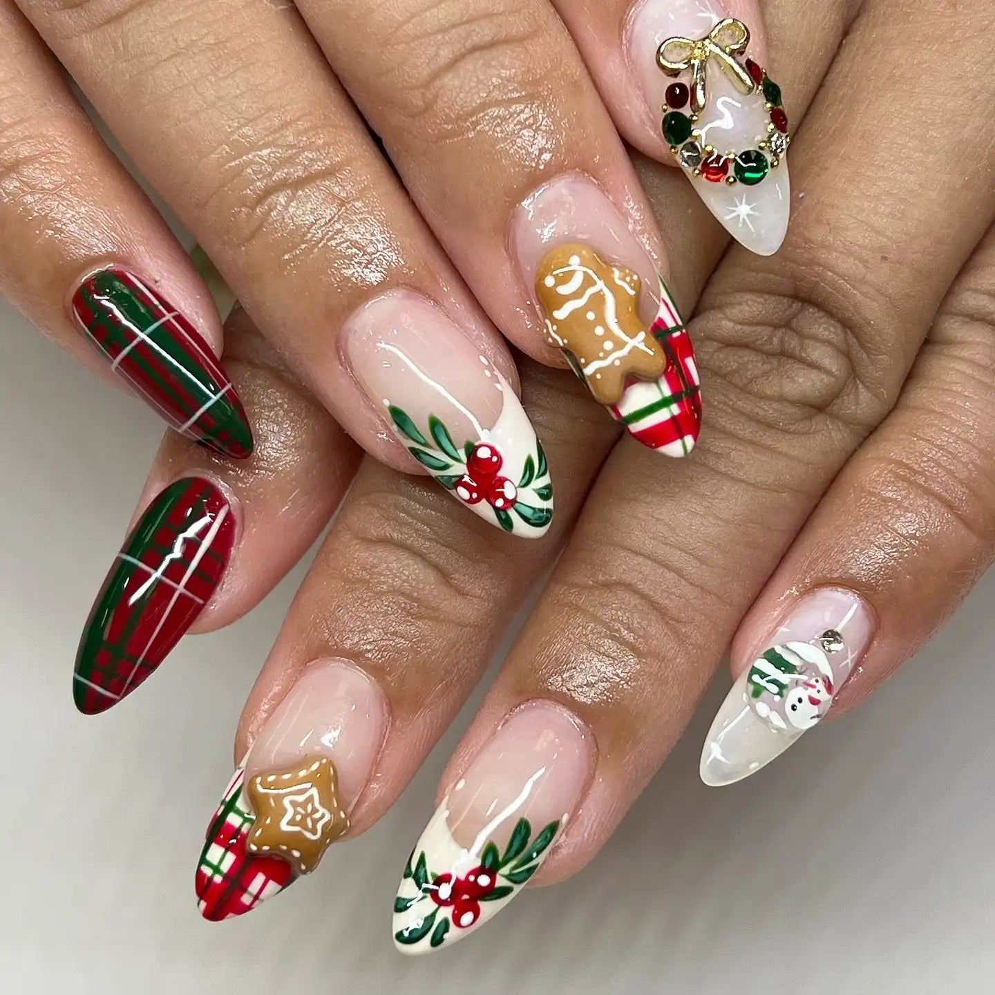 Handmade Christmas Plaid Gingerbread Holly Wreath Press on Nails V60