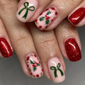 Celebrate the season with these cheerful handmade press-on nails! They feature sparkling red glitter, festive holly berries, and charming green bows with gold accents. Reusable and customizable, these unique fingernails are perfect for Christmas parties or adding holiday cheer to daily wear. Available in various shapes and lengths and a glossy finish. Get your festive set now!