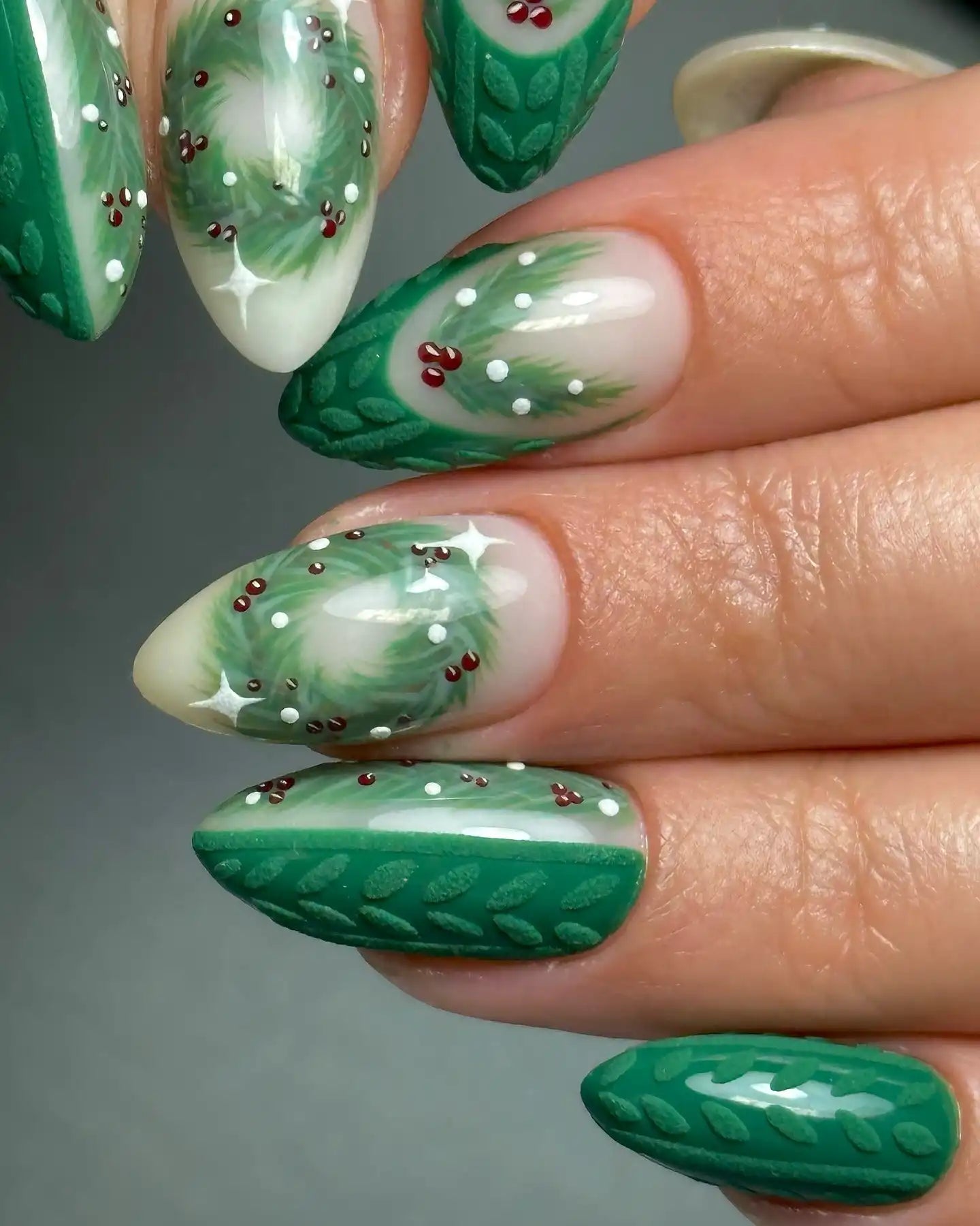 Handmade Christmas Sweater Holly Berries Wreath Green Press on Nails W88