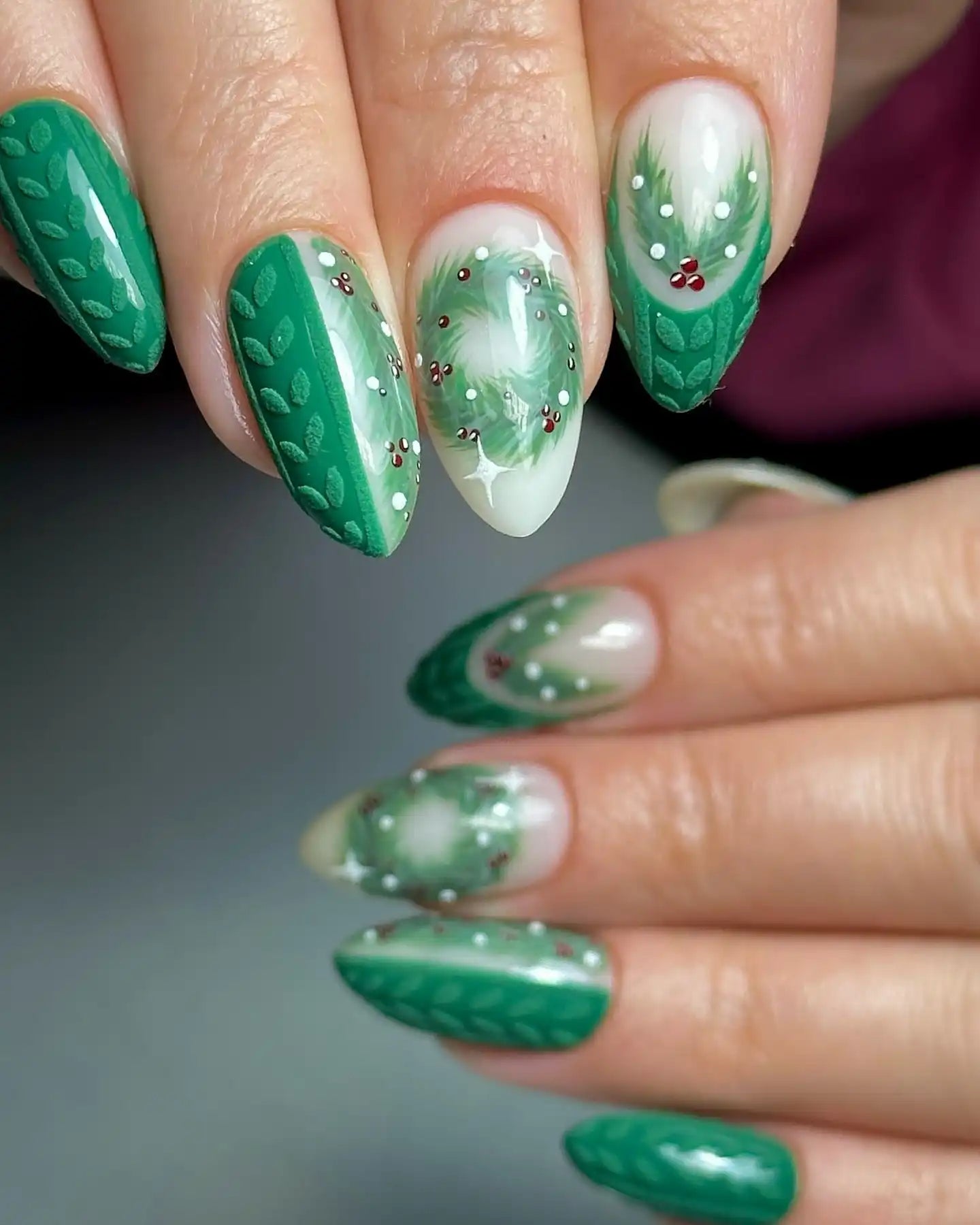 Embrace the holiday season with these charming handmade press-on nails! They feature a cozy green sweater texture, festive wreaths, and hand-painted holly berries. Reusable and customizable, these unique fingernails are perfect for holiday gatherings or daily wear. Available in various shapes and lengths. Get your festive set now!