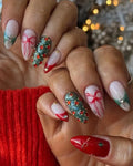Adorn your fingers with these exquisite handmade press-on nails! They feature sparkling Christmas tree glitter, festive red accents, elegant bows, and brilliant rhinestones. Reusable and customizable, these unique fingernails are perfect for holiday parties or adding luxurious cheer to daily wear. Available in various shapes and lengths and a glossy finish. Get your festive set now!