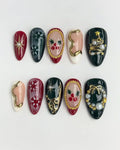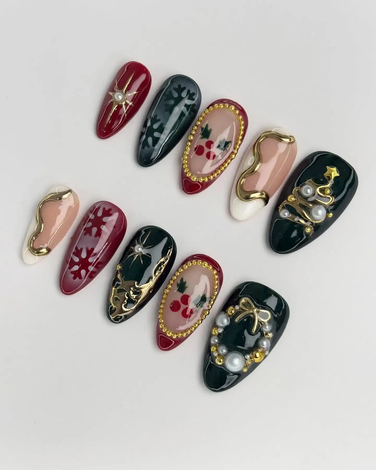 Handmade press-on nails featuring elegant gold accents, Christmas trees, holly berries, pearls, and festive wreath designs. Reusable and customizable in shapes and lengths like Almond, Coffin, Oval, Square, or Stiletto. Perfect for Christmas parties, winter holidays, or glam daily wear. Add luxurious holiday sparkle to your fingertips—order your festive nail set today!