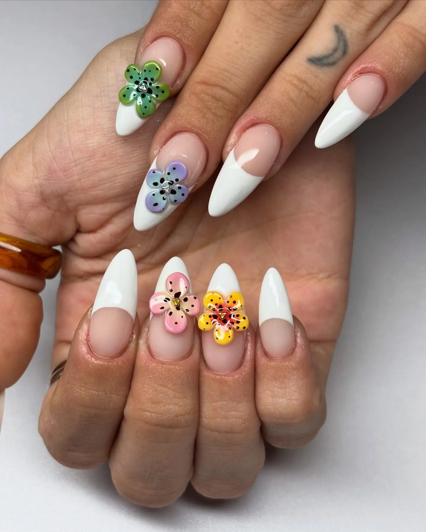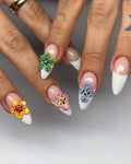 Designed to brighten every gesture, these handmade press-on nails feature crisp French tips topped with vibrant floral charms and sparkling crystals. Reusable and lightweight, they offer customizable designs for any event or daily wear. A glossy finish elevates your fingernails, with options across many shapes and lengths for a perfect fit. Make your manicure unforgettable—order this joyful set now.
