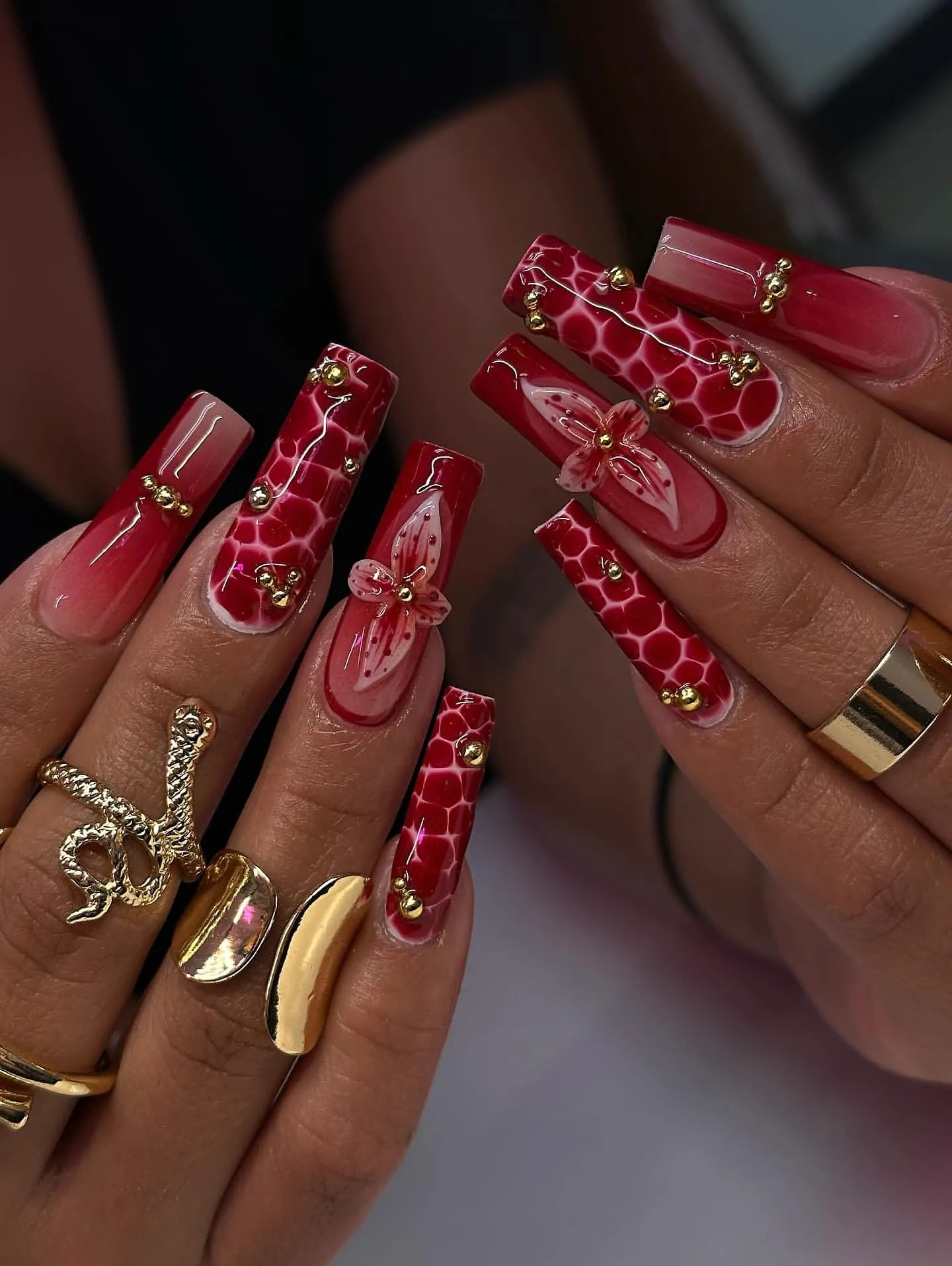 Handmade Crimson Red Ombre Crocodile Print 3D Flower Press on Nails Z09