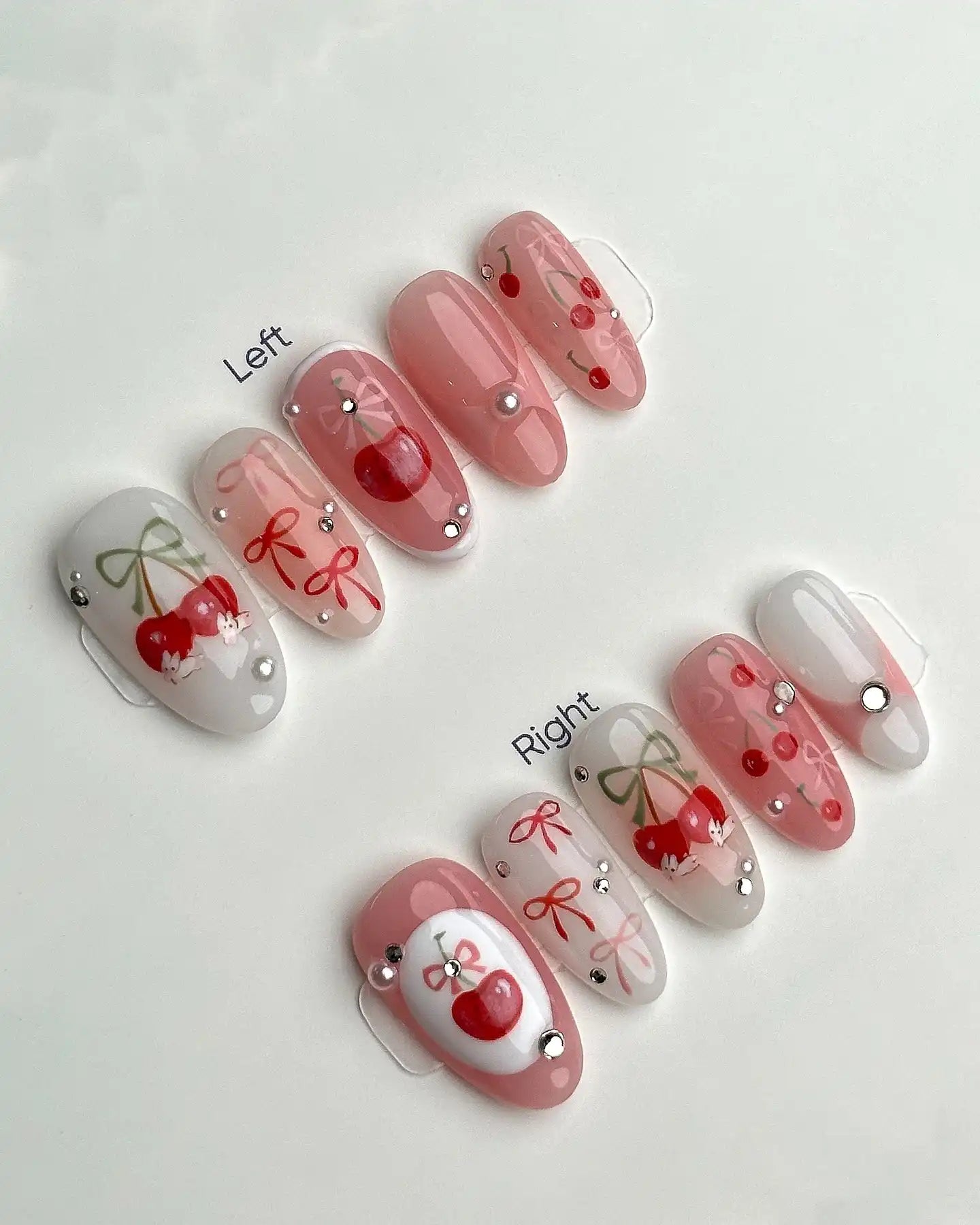 Sweeten your fingernails with this delightful set of handmade press-on nails. Featuring reusable adorable cherry and bow designs with tiny pearl accents and a lovely glossy finish. These customizable designs come in many shapes and lengths (Short, Medium, or Long, and shapes like Almond, Coffin, or Oval). Perfect for daily wear or a fun event, they add a playful touch. Anyone who loves cute, fruity aesthetics will adore them. Indulge in this charming set for a touch of sweetness!