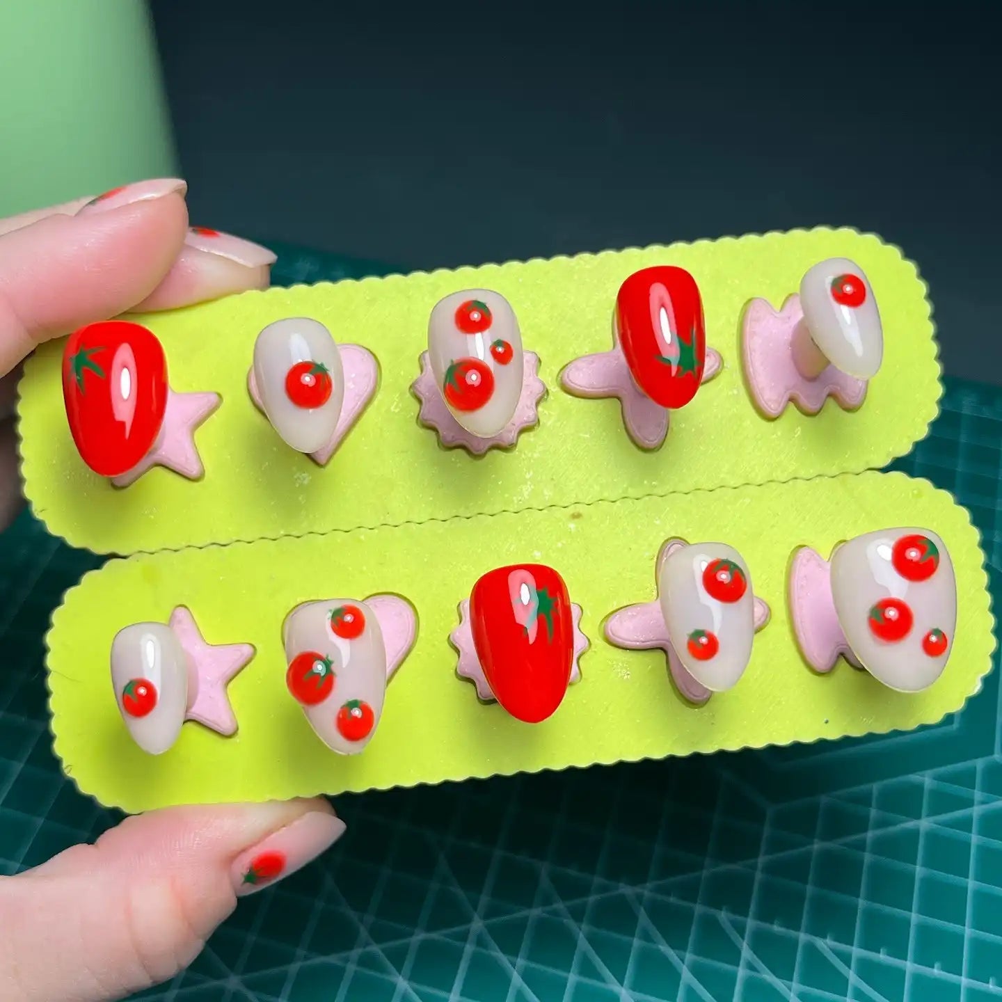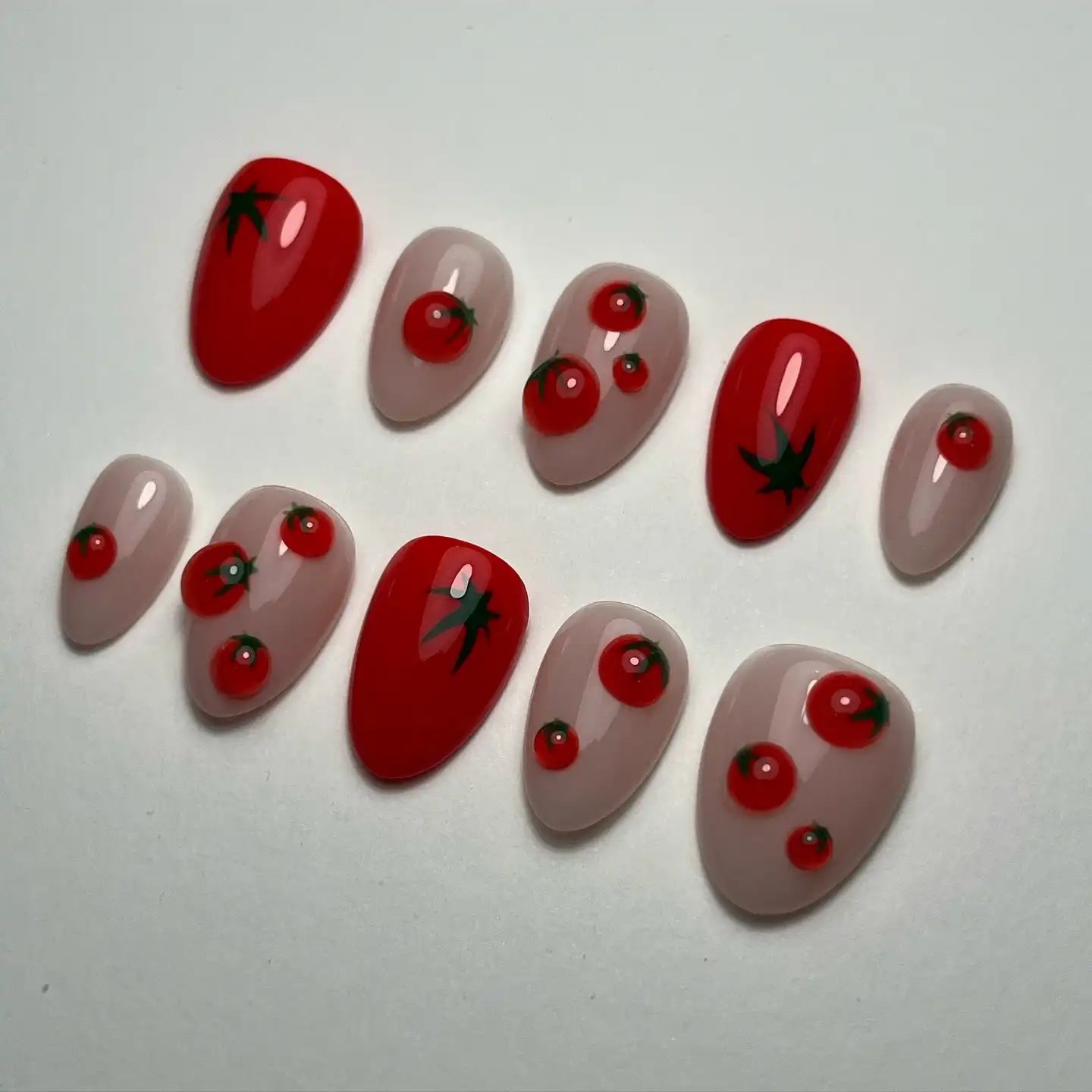 Add a fresh, playful twist with these handmade, reusable press-on nails! Enjoy a cute, unique look instantly. Featuring vibrant 3D red tomatoes on a soft nude background with a clear glossy finish, these nails are perfect for any event or daily wear. Their delightful, farmhouse-inspired designs make them stand out. Get yours now and add some fun flavor!
